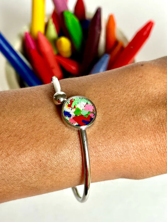 Real crayon shavings sealed in resin & stainless steel.