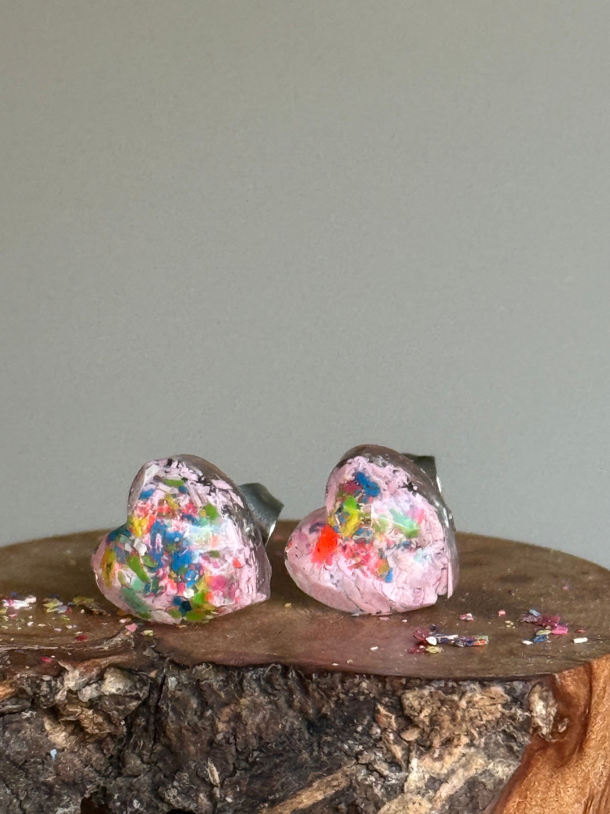 These small resin studs look like little gems! Created with recycled crayons, each pair is shimmery and gentle on your ears due to our hypoallergenic posts.