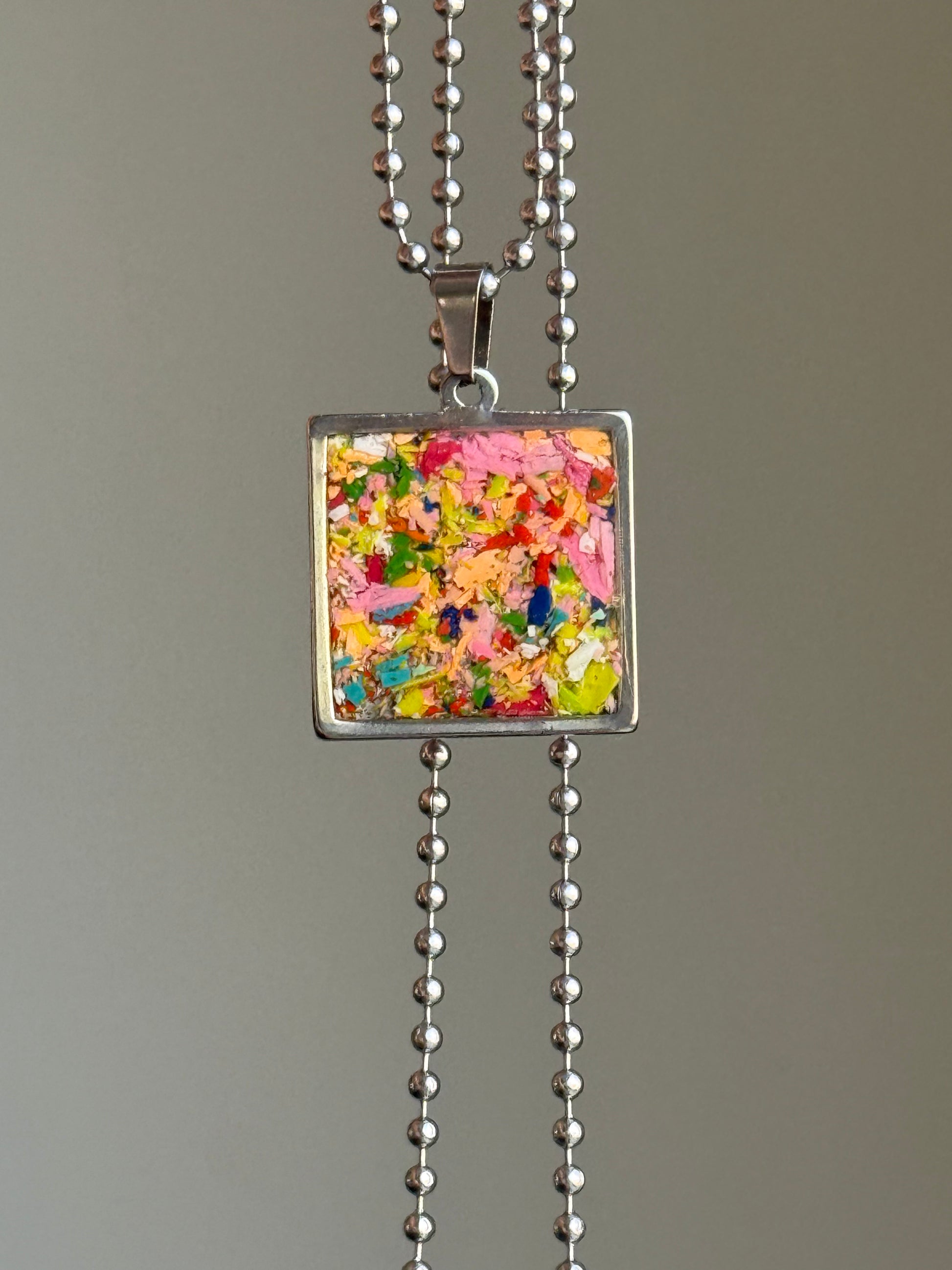 Every crayon shaving is hand placed, creating a colorful texture and combination unique in its own way. Each pendant has its own personality, just like the women who wear them.