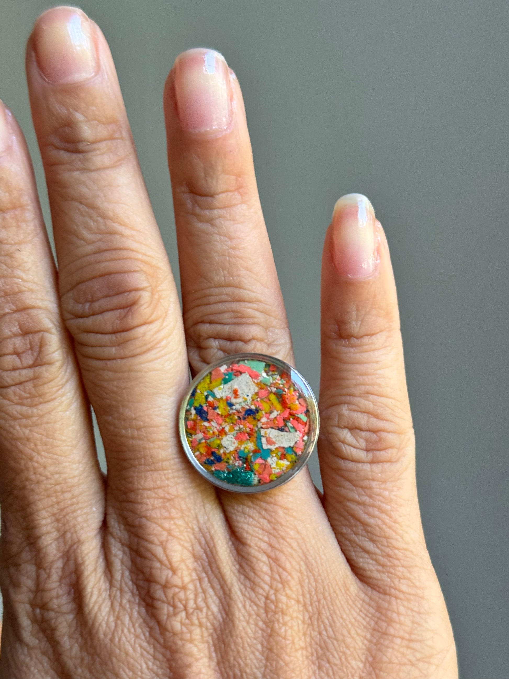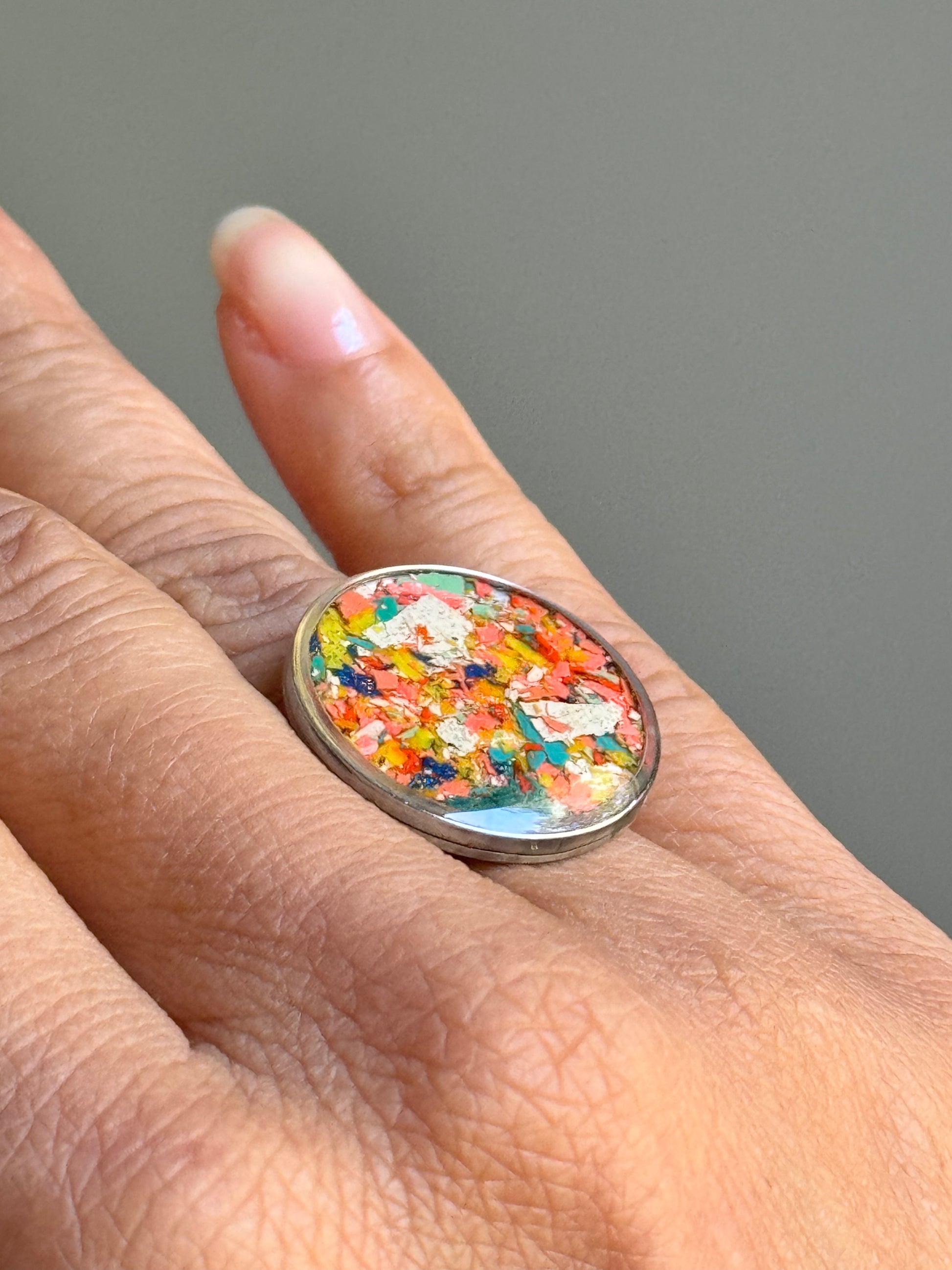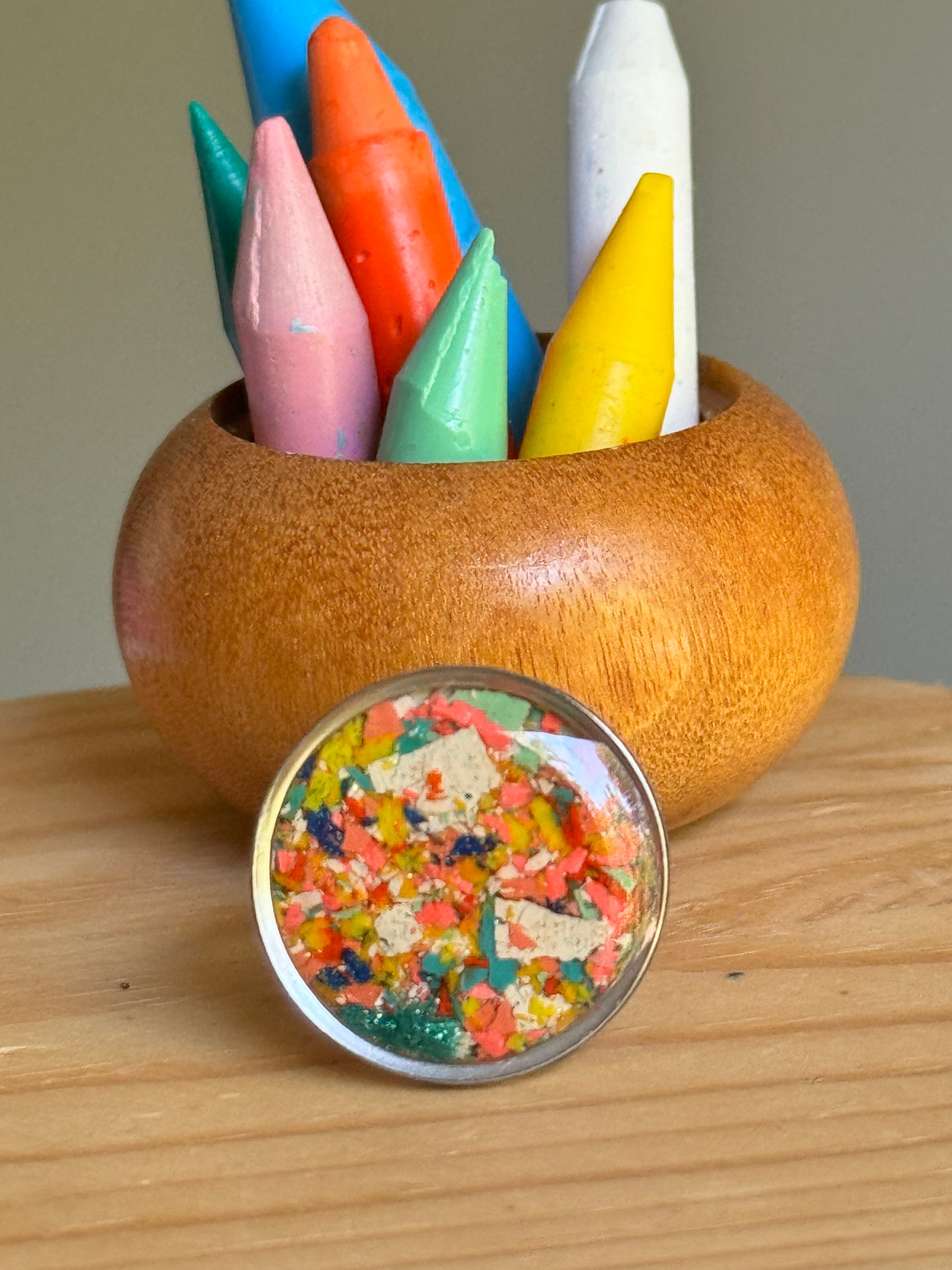 Anillo grande y redondo de acero inoxidable relleno con virutas de crayón colocadas a mano. Este es un anillo colorido, divertido y llamativo.
