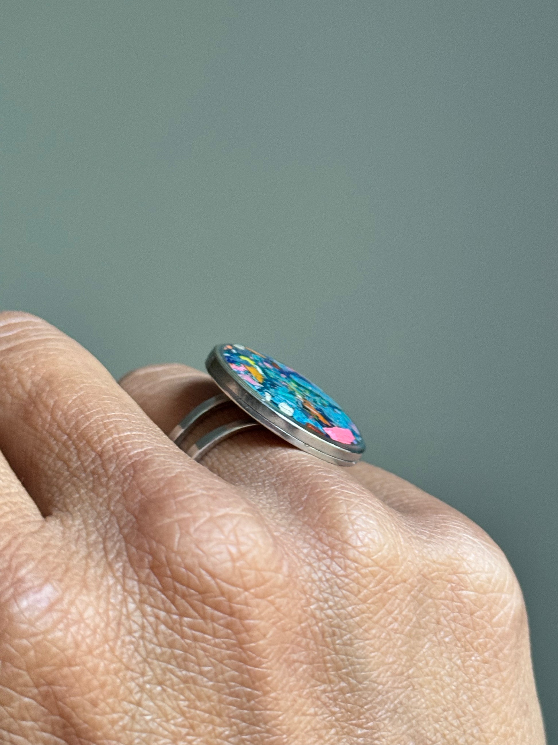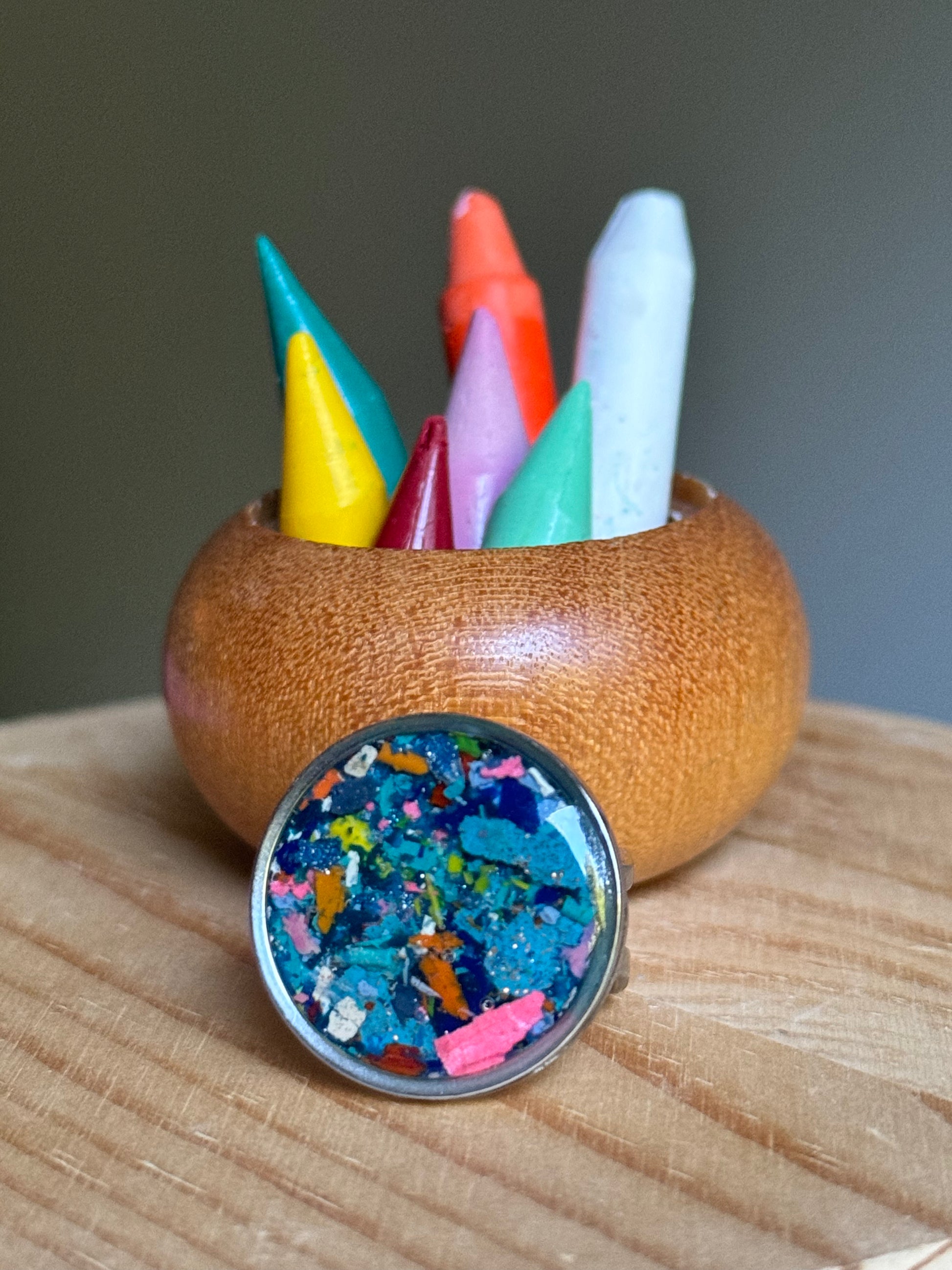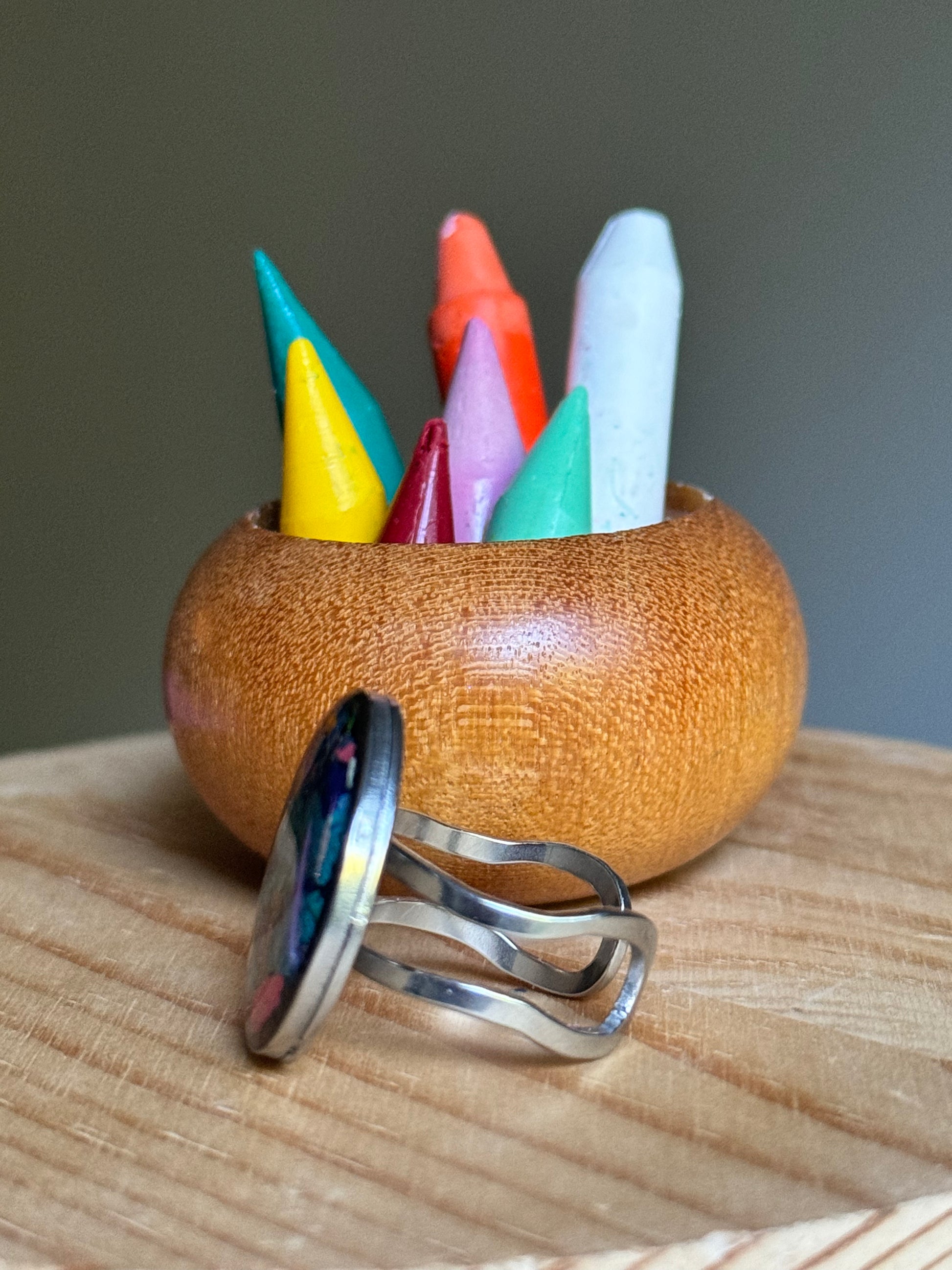 Anillo grande y redondo de acero inoxidable lleno de virutas de crayón colocadas a mano.