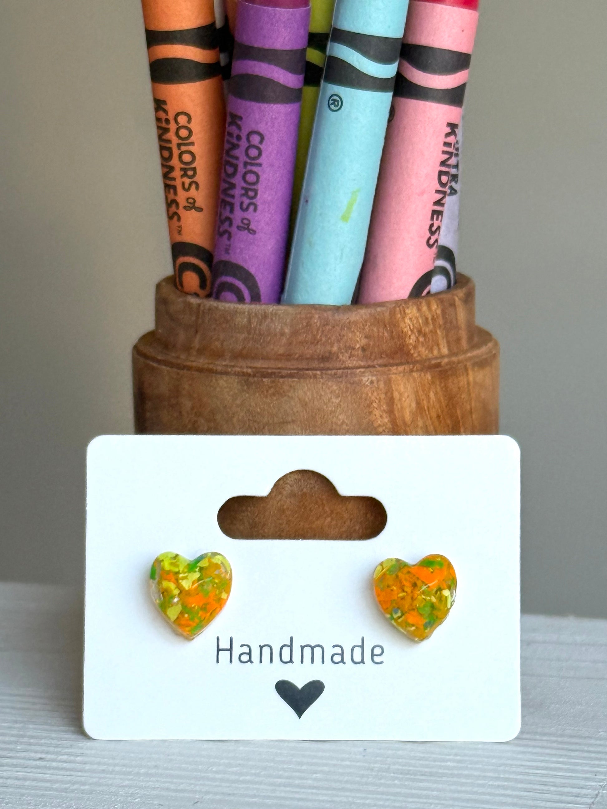 These small resin studs look like little gems! Created with recycled crayons, each pair is colorful and gentle on your ears due to our hypoallergenic posts.