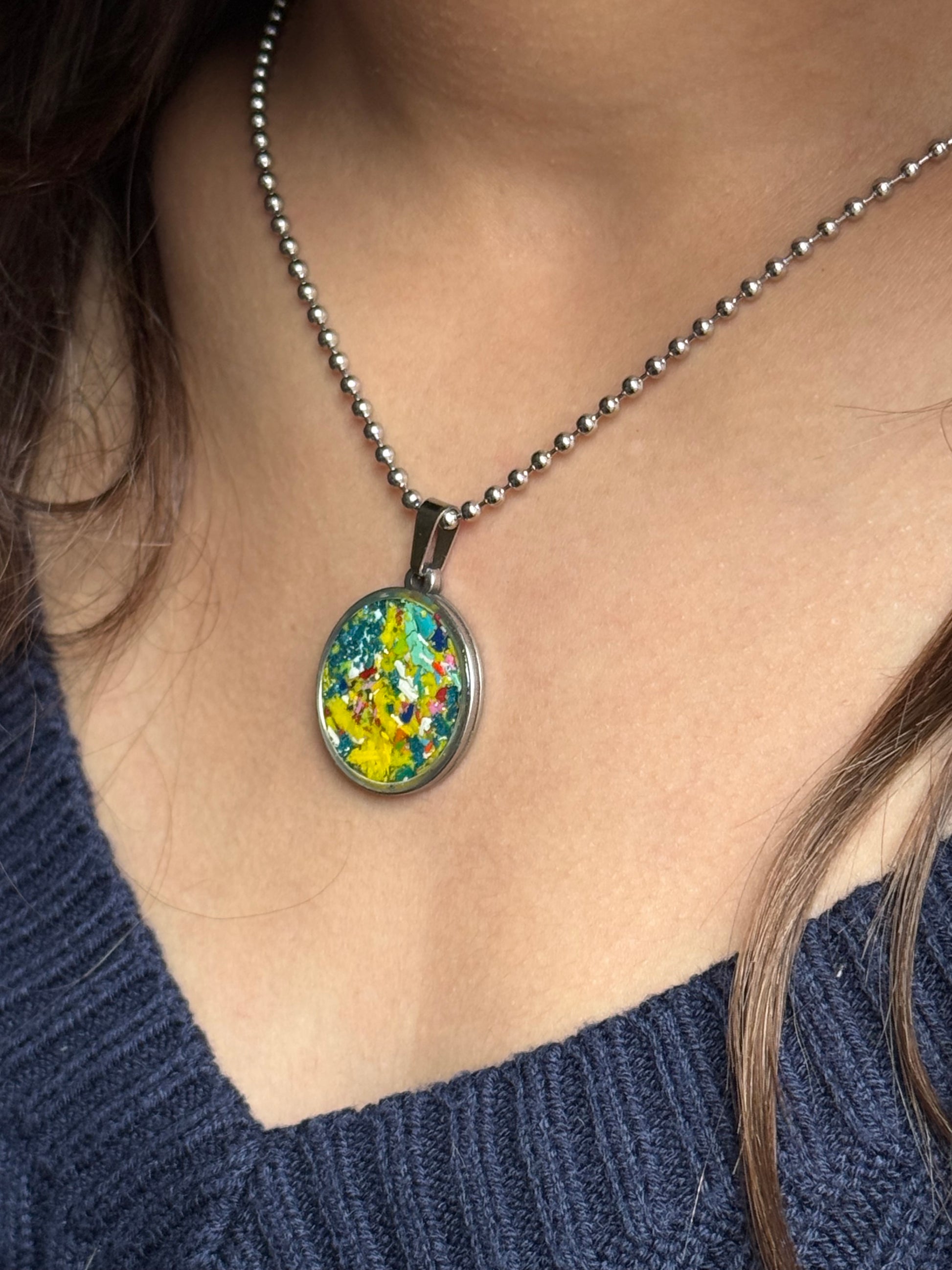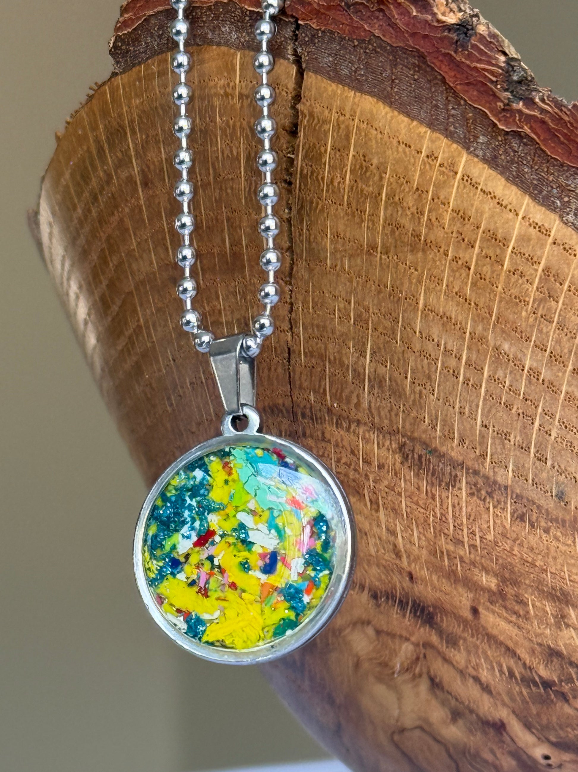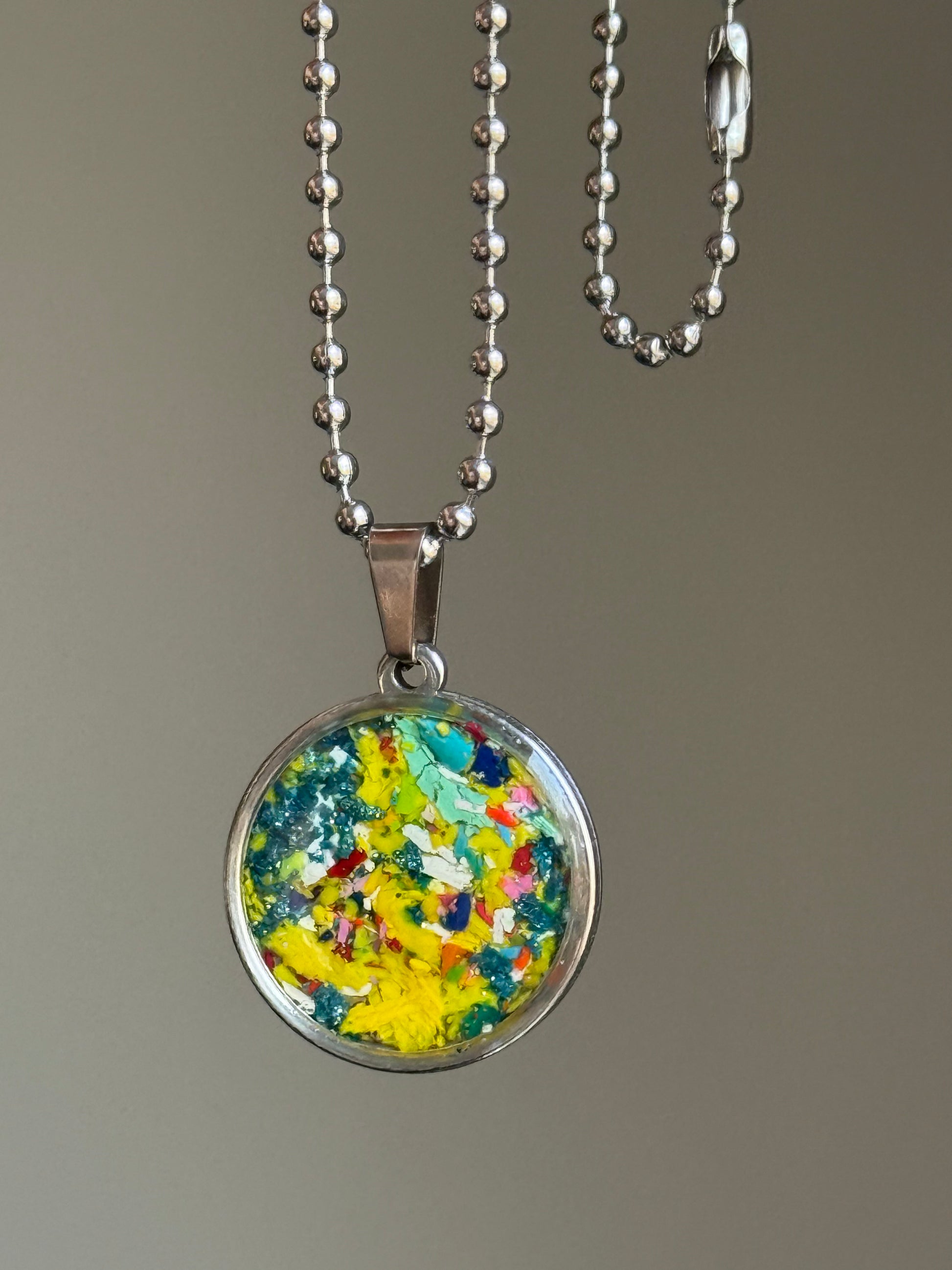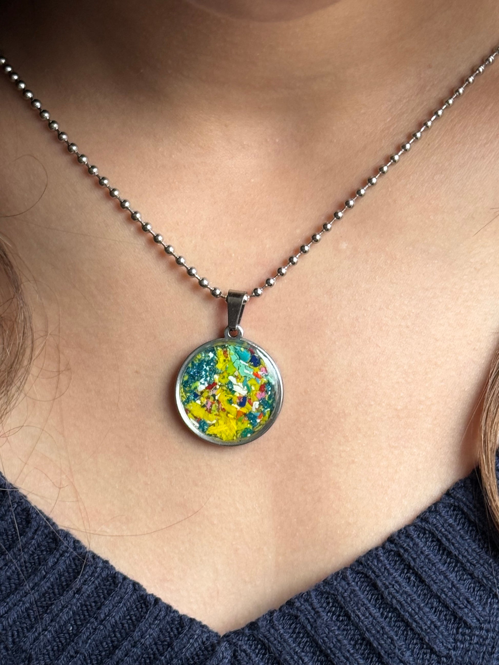 Muestra tu lado colorido con este colgante redondo de acero inoxidable con virutas de crayón de colores. Las virutas de crayón recicladas se colocaron a mano para crear un aspecto y una sensación texturizados. ¡Para los más atrevidos!