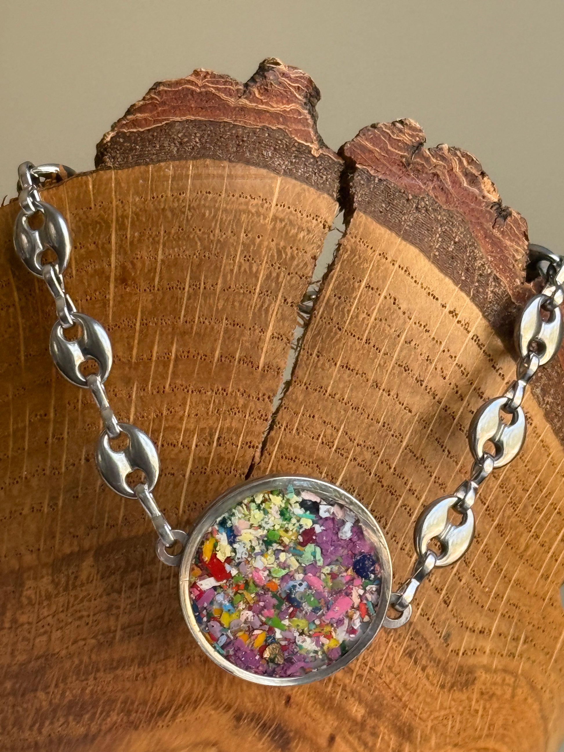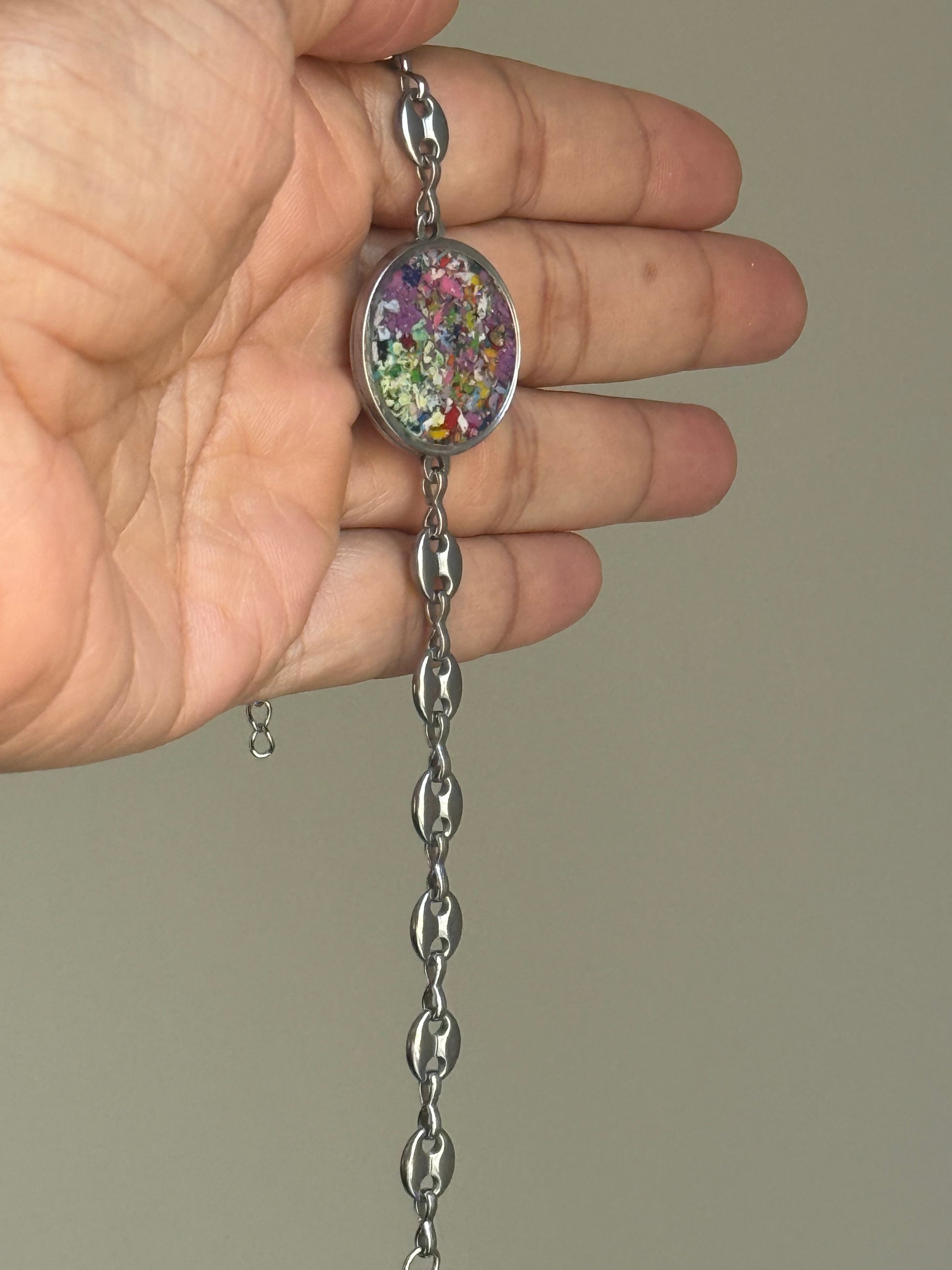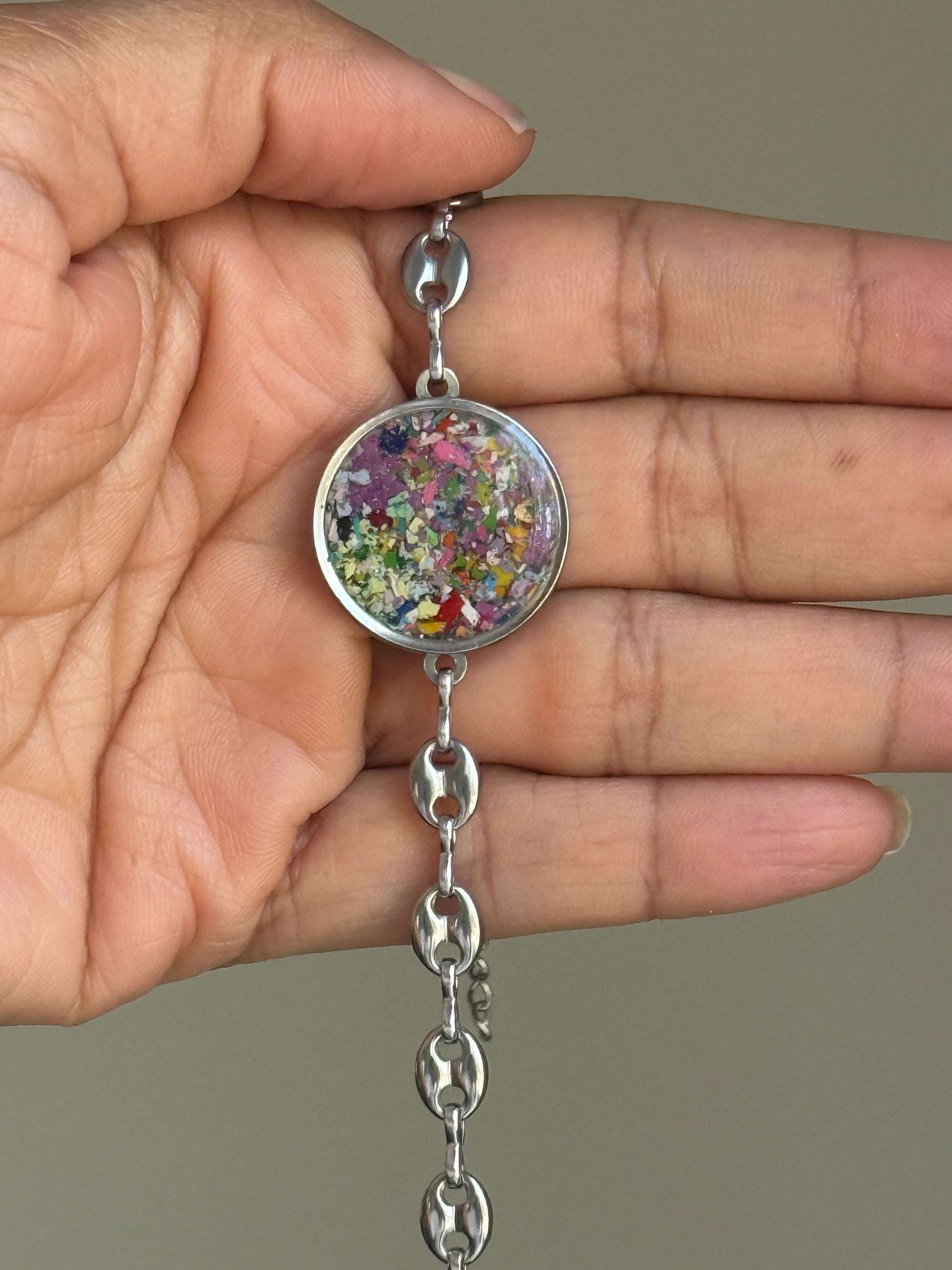 Esta es una pulsera de cadena de acero inoxidable atrevida, divertida y alegre. La llamamos la pulsera "Pebbles". Llévala sola o con tus otras pulseras.