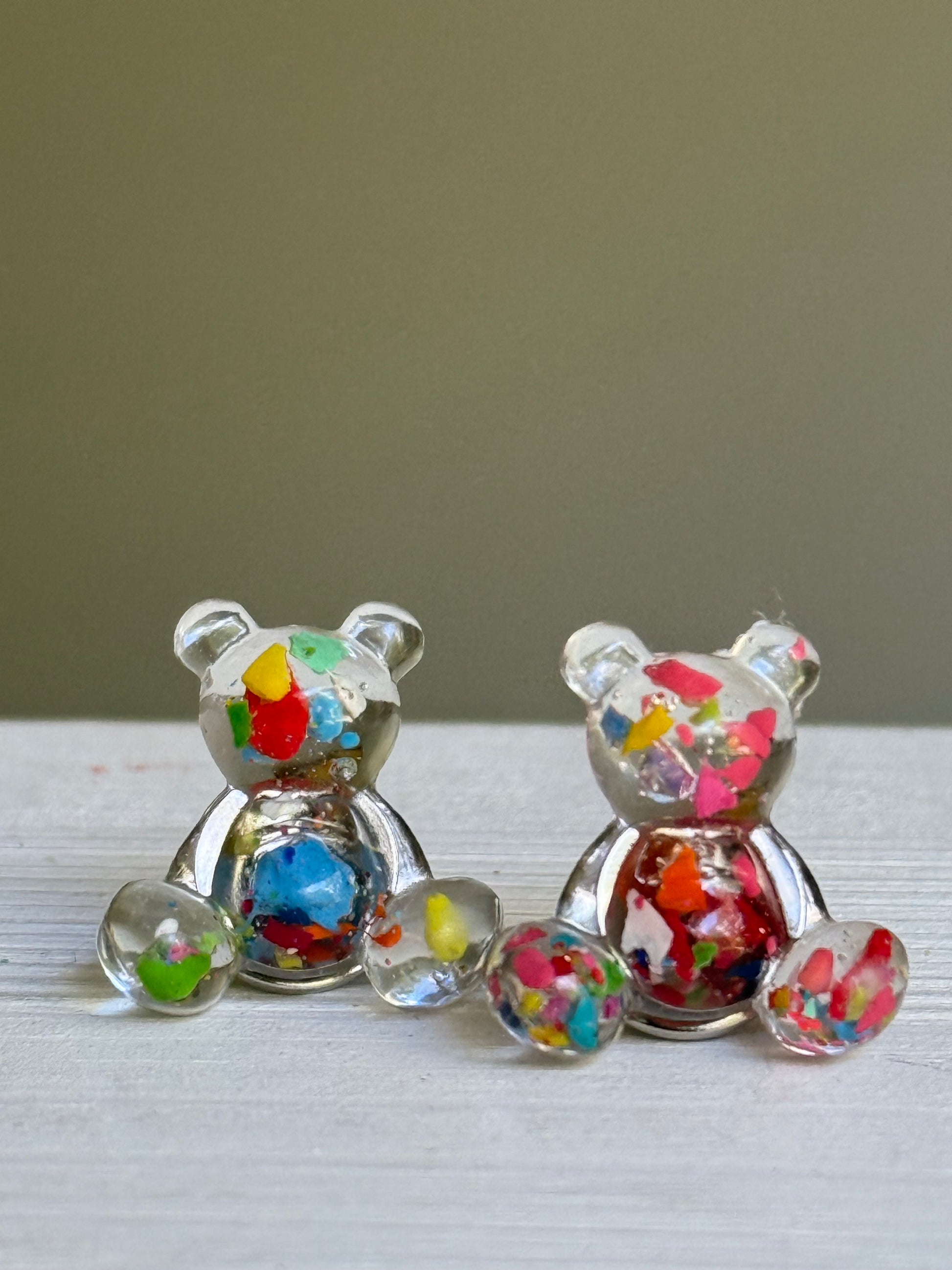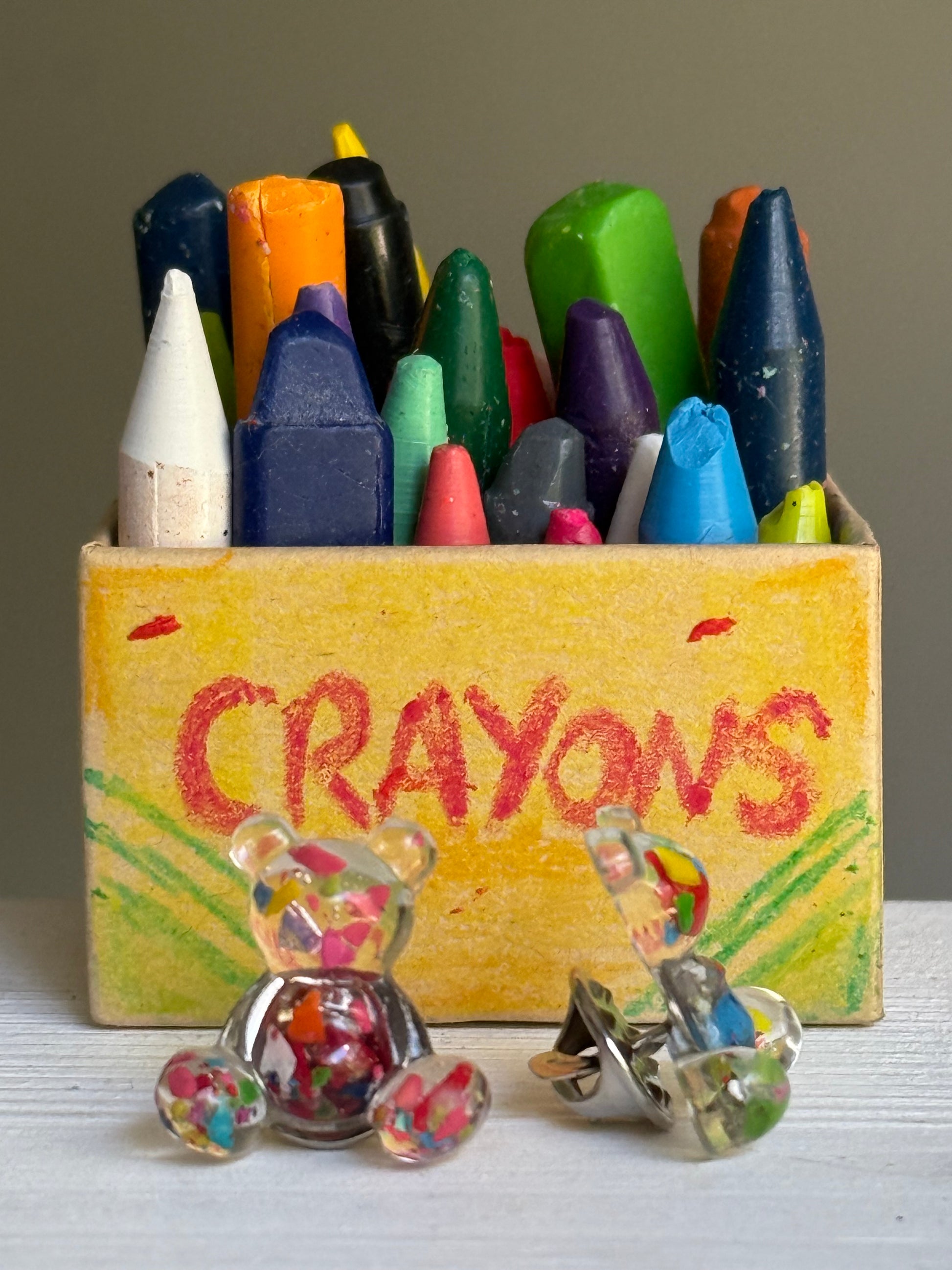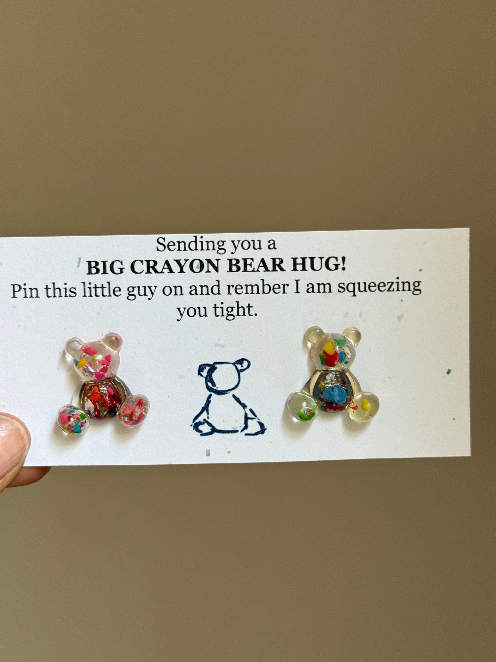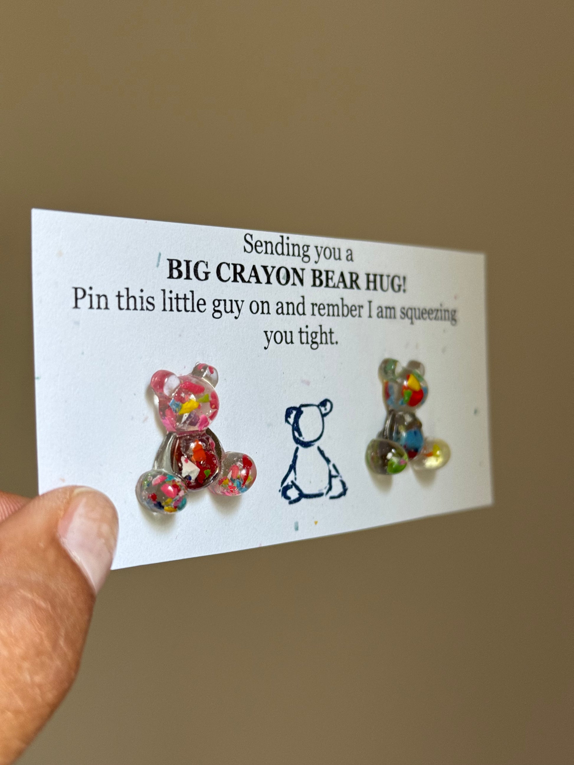 Our Crayon Bear Hug Push Pins are hand-made with recycled crayons. These crayon bear push pins are perfect for anyone who could use a hug in their day. Comes in a pair.