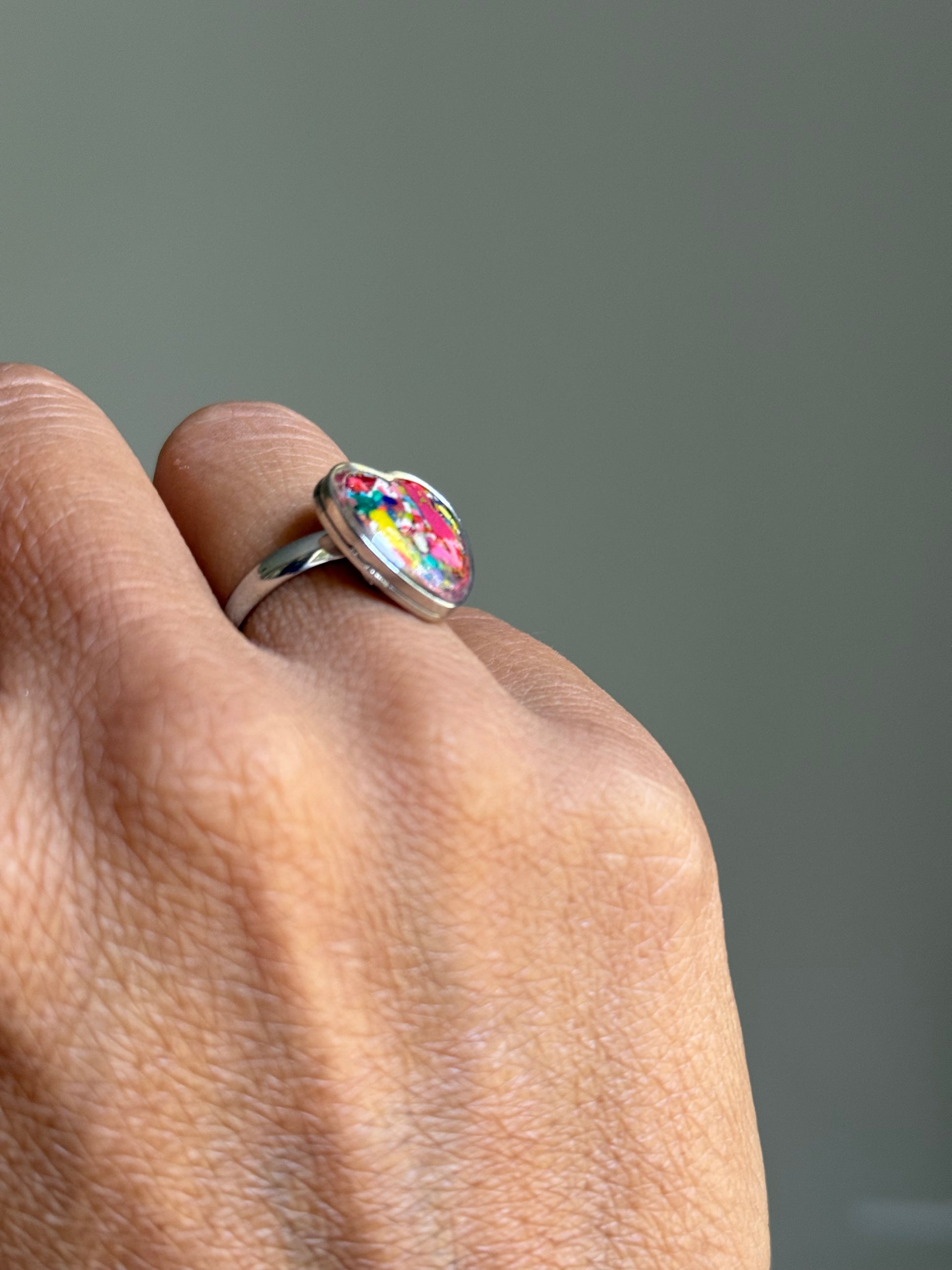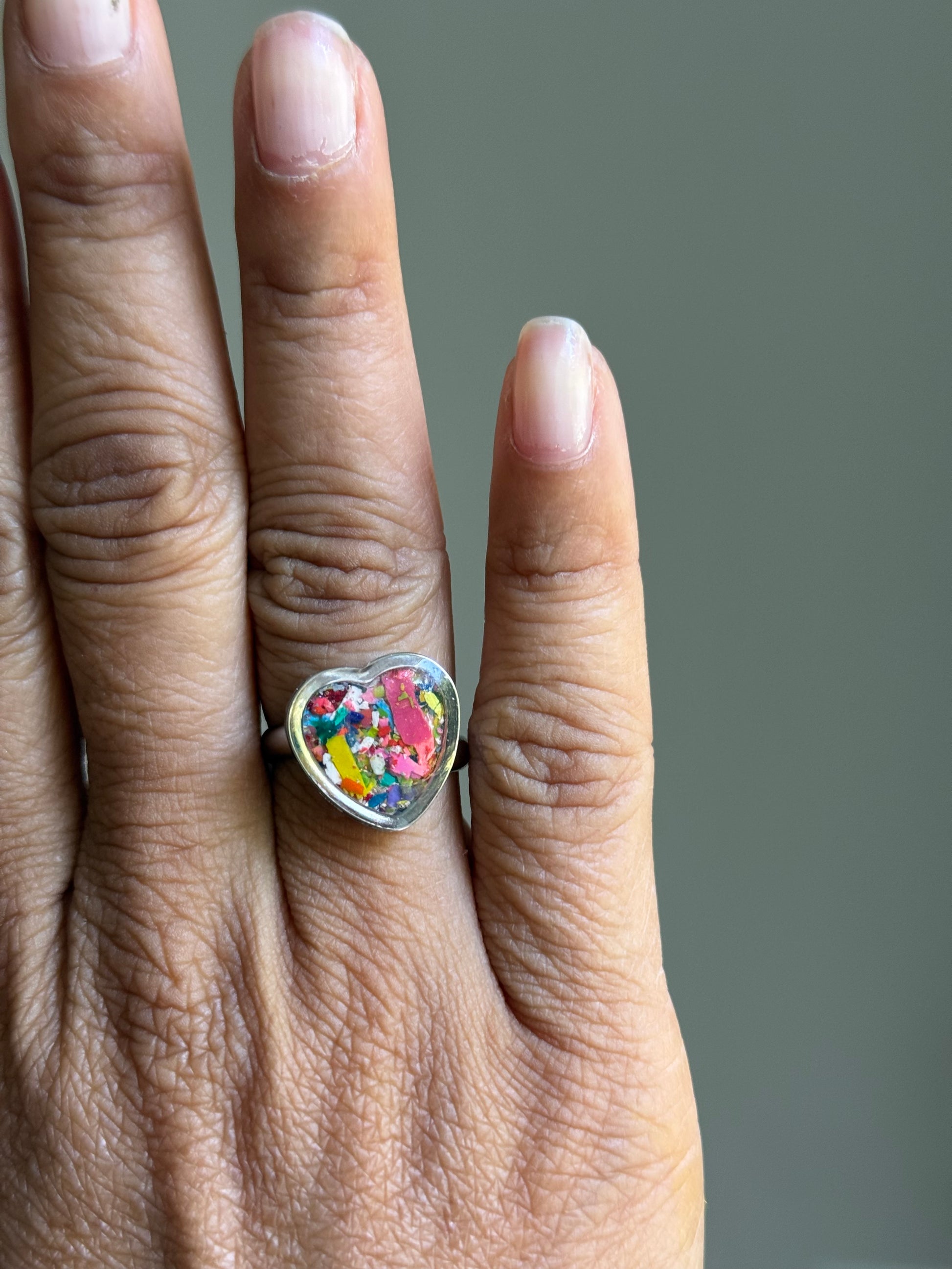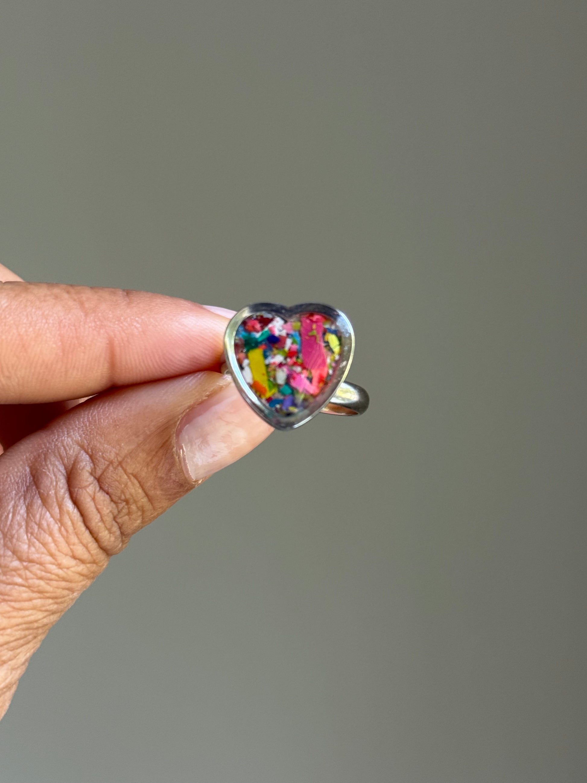A playful reminder to wear your heart on your finger! This stainless steel ring is filled carefully hand-placed crayon shavings creating a beautiful & unique color combination. Our color combinations are unique and may vary.