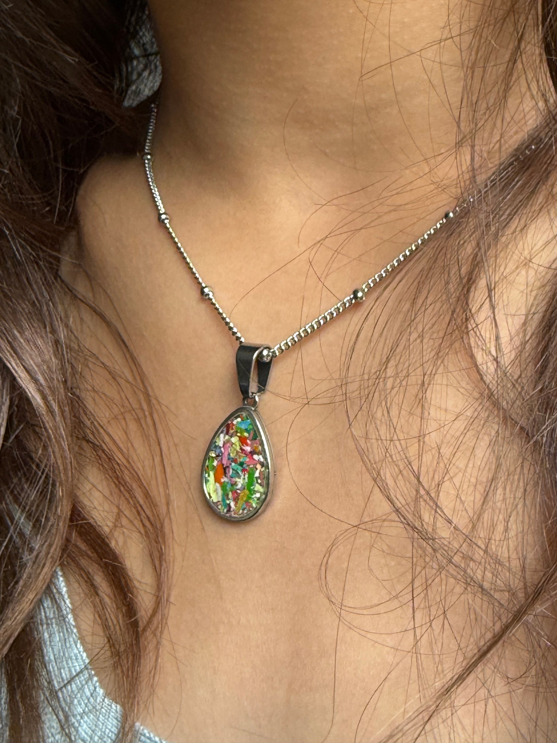 Gota mean "raindrop" in Spanish. Our small Gota Crayon Pendant is filled with hand-placed crayon shavings creating a unique color combination. This is the sweetest raindrop-style pendant you will ever own! This is the only one of its kind, so don't wait too long to get it.
