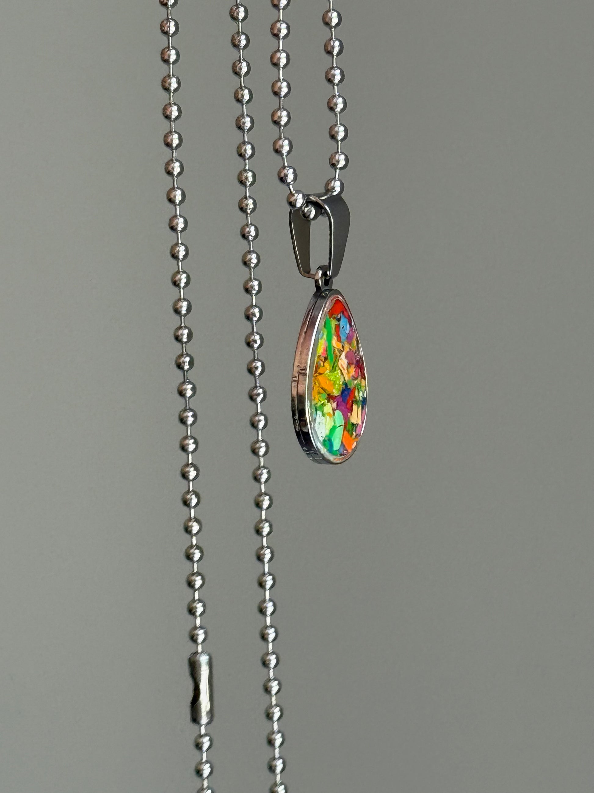 Gota mean "raindrop" in Spanish. Our small Gota Crayon Pendant is filled with hand-placed crayon shavings creating a unique color combination. This is the sweetest raindrop-style pendant you will ever own! This is the only one of its kind, so don't wait too long to get it.