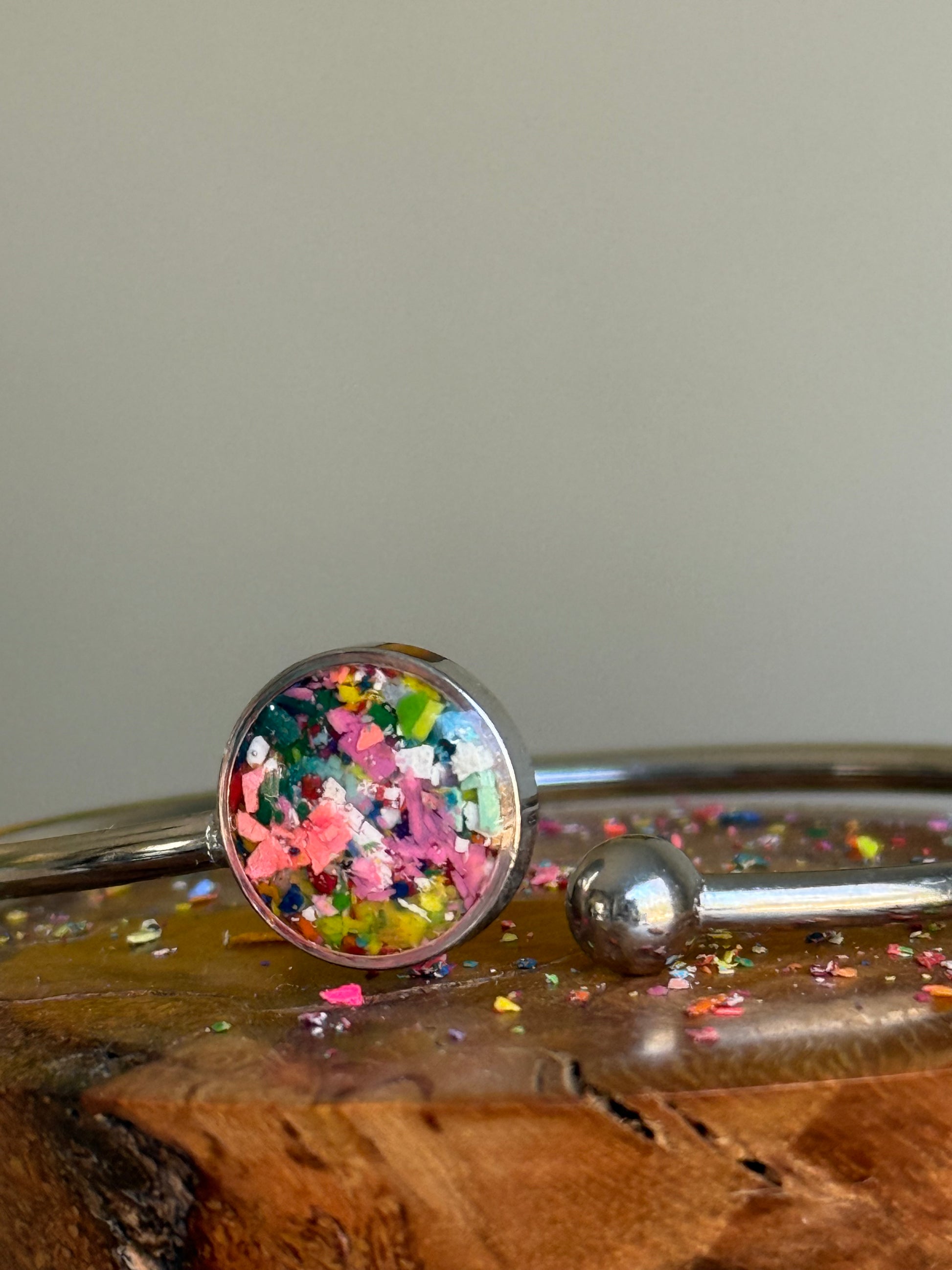 Offrez une pause à vos bracelets délicats et optez pour ce bracelet manchette flexible en acier inoxydable rempli de copeaux de crayons colorés. Portez-le seul ou associez-le à vos autres bracelets.