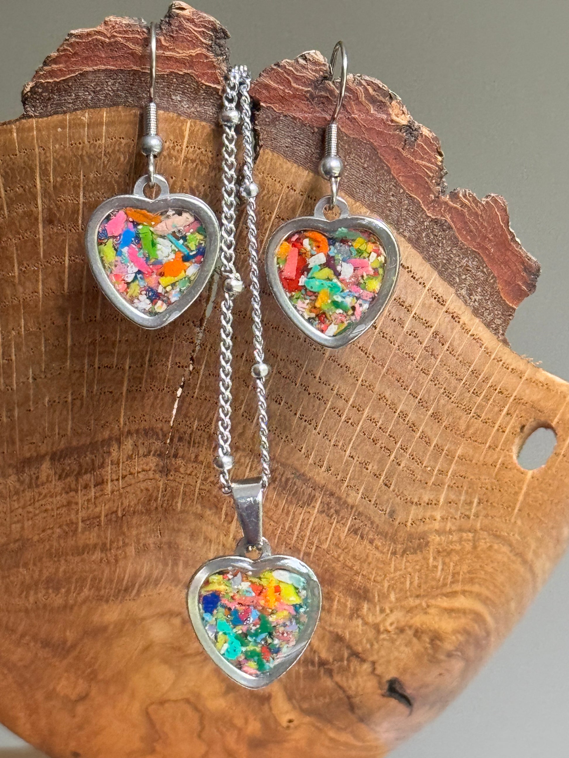 Our Viva Heart set is colorful and sweet. Included in this set: heart-shaped pendant, heart-shaped dandling earrings and stainless steel chain. Give colorful love.