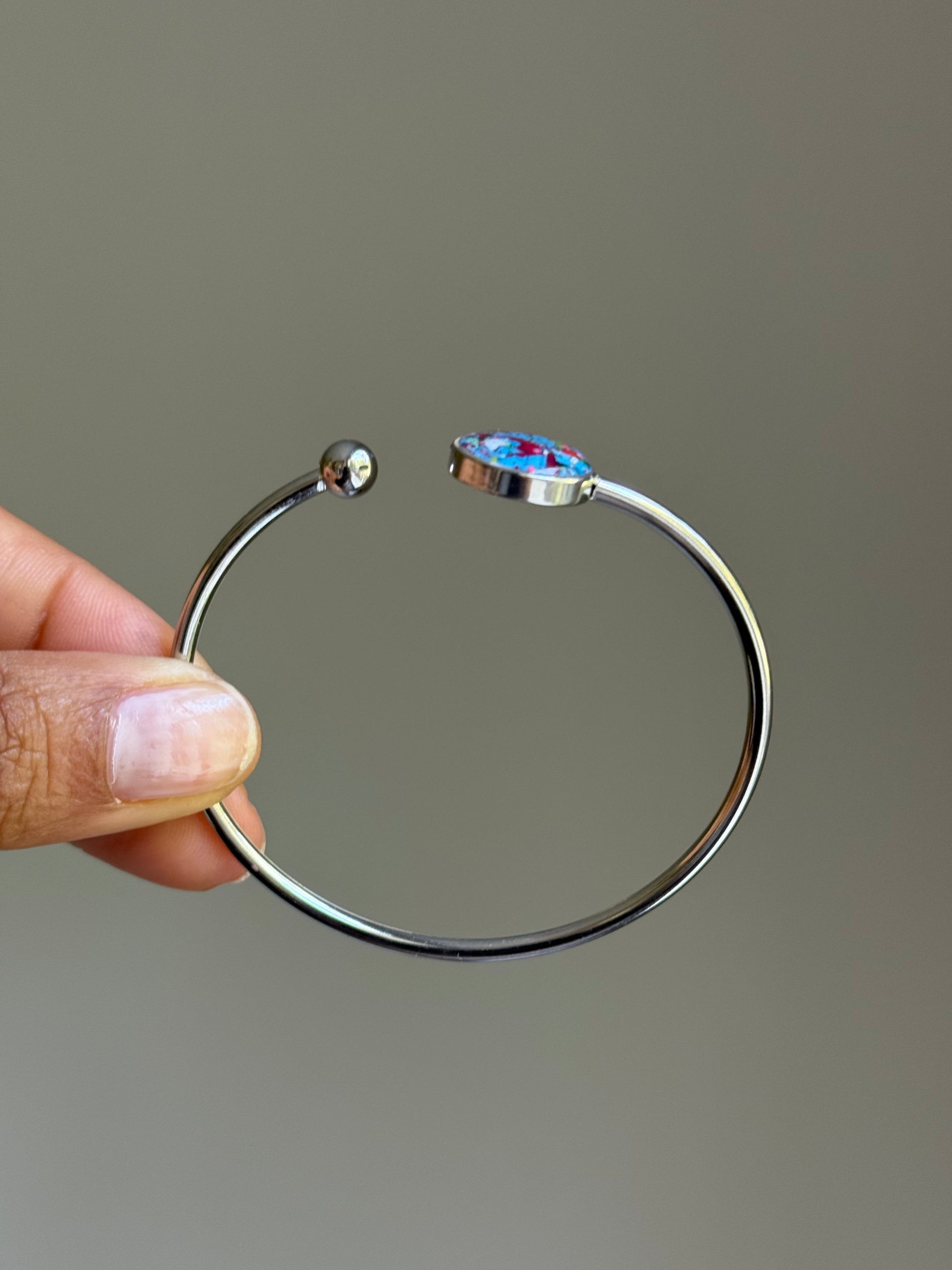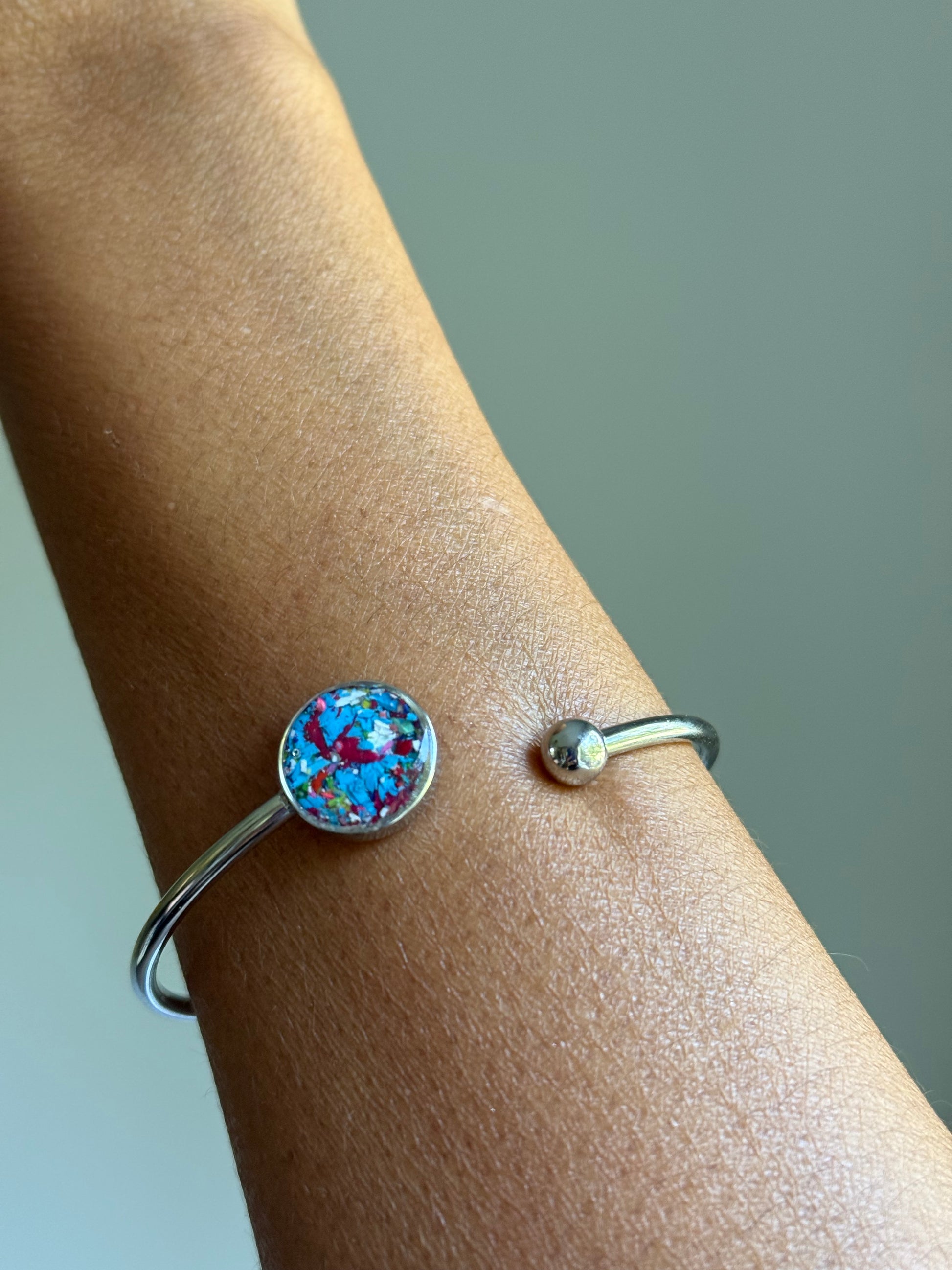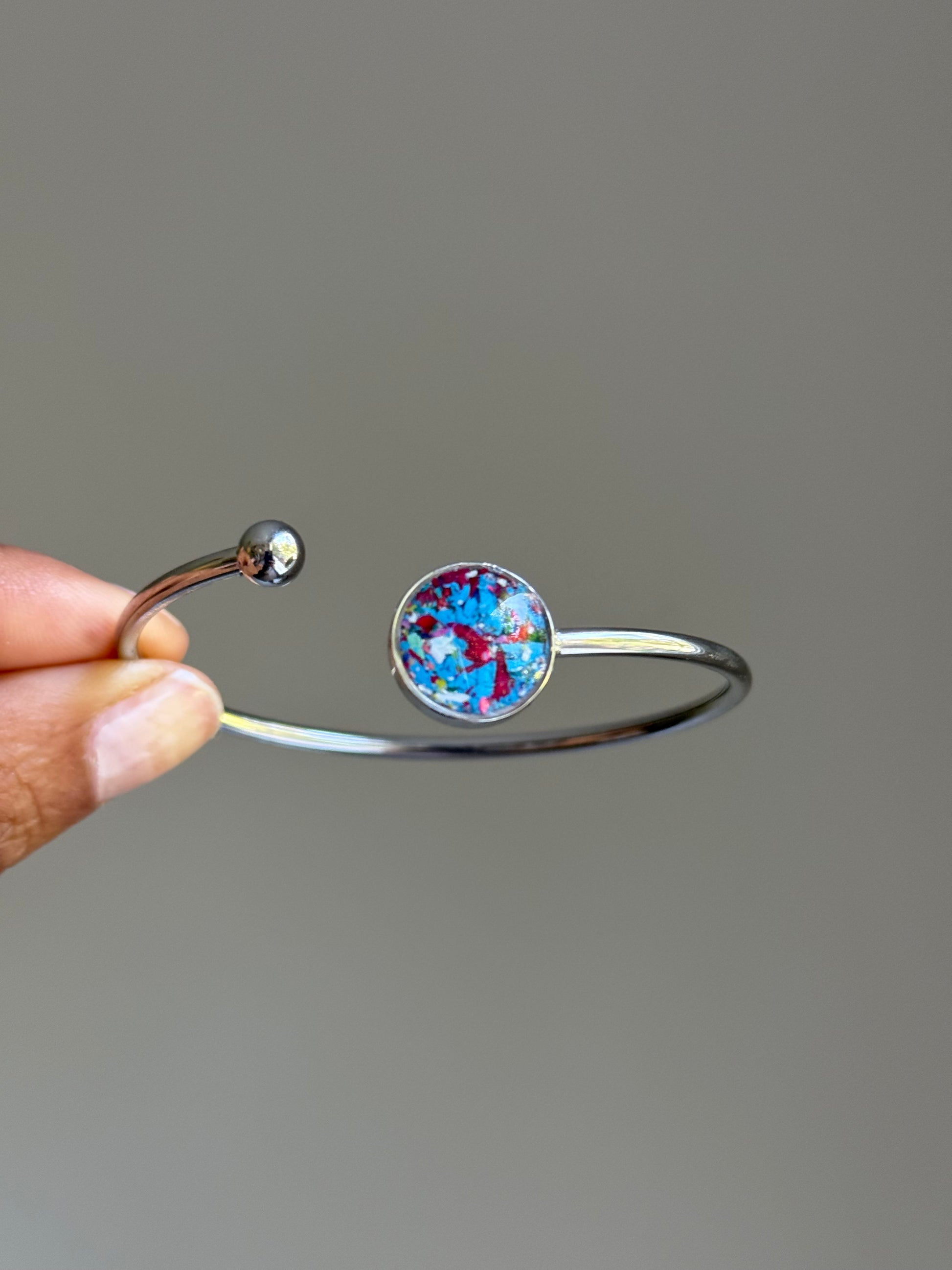 Give your delicate bracelets a break and go for this flexible, stainless-steel cuff bracelet filled with colorful crayon shavings hand placed to create a textured & mosaic look.