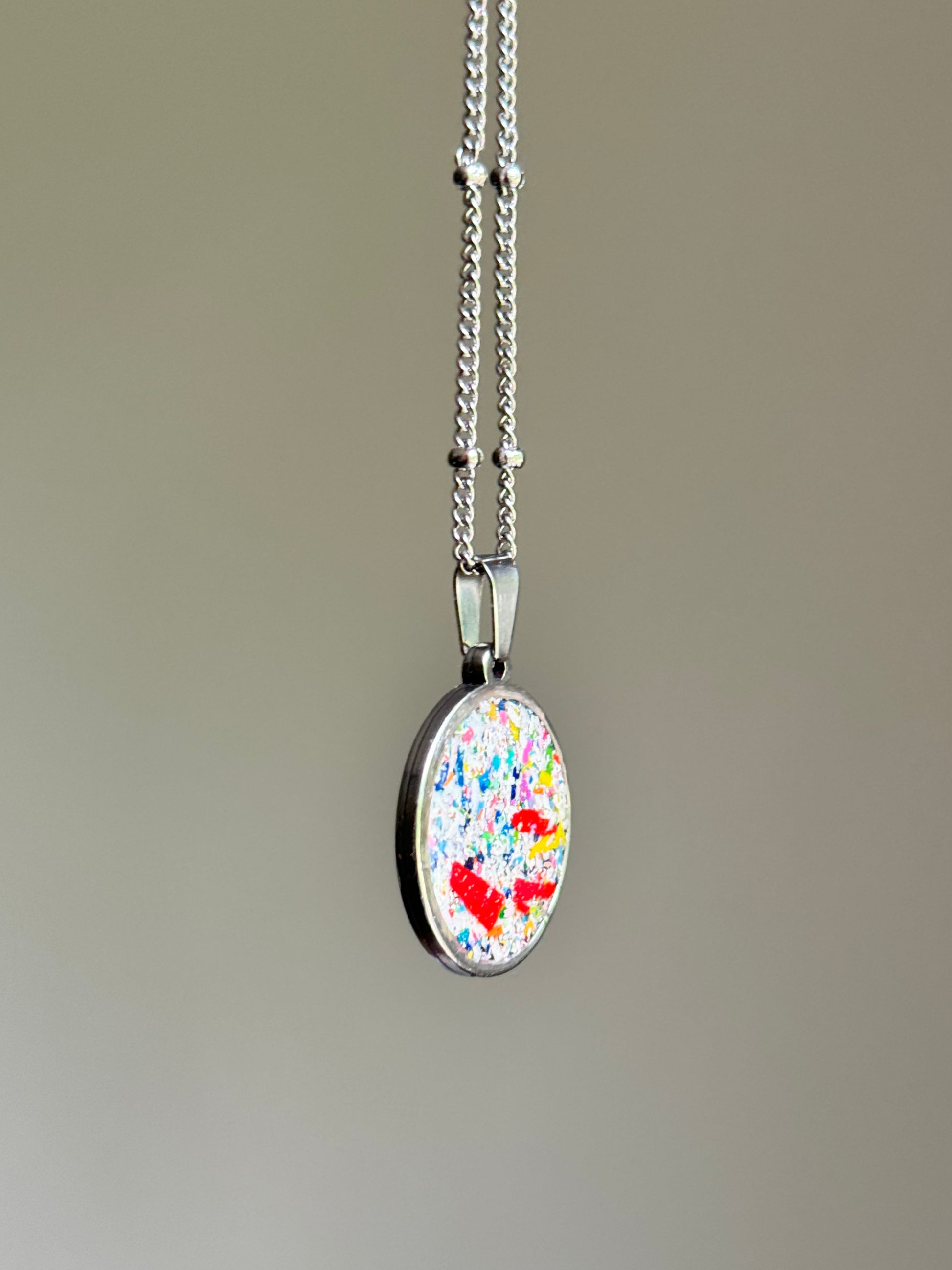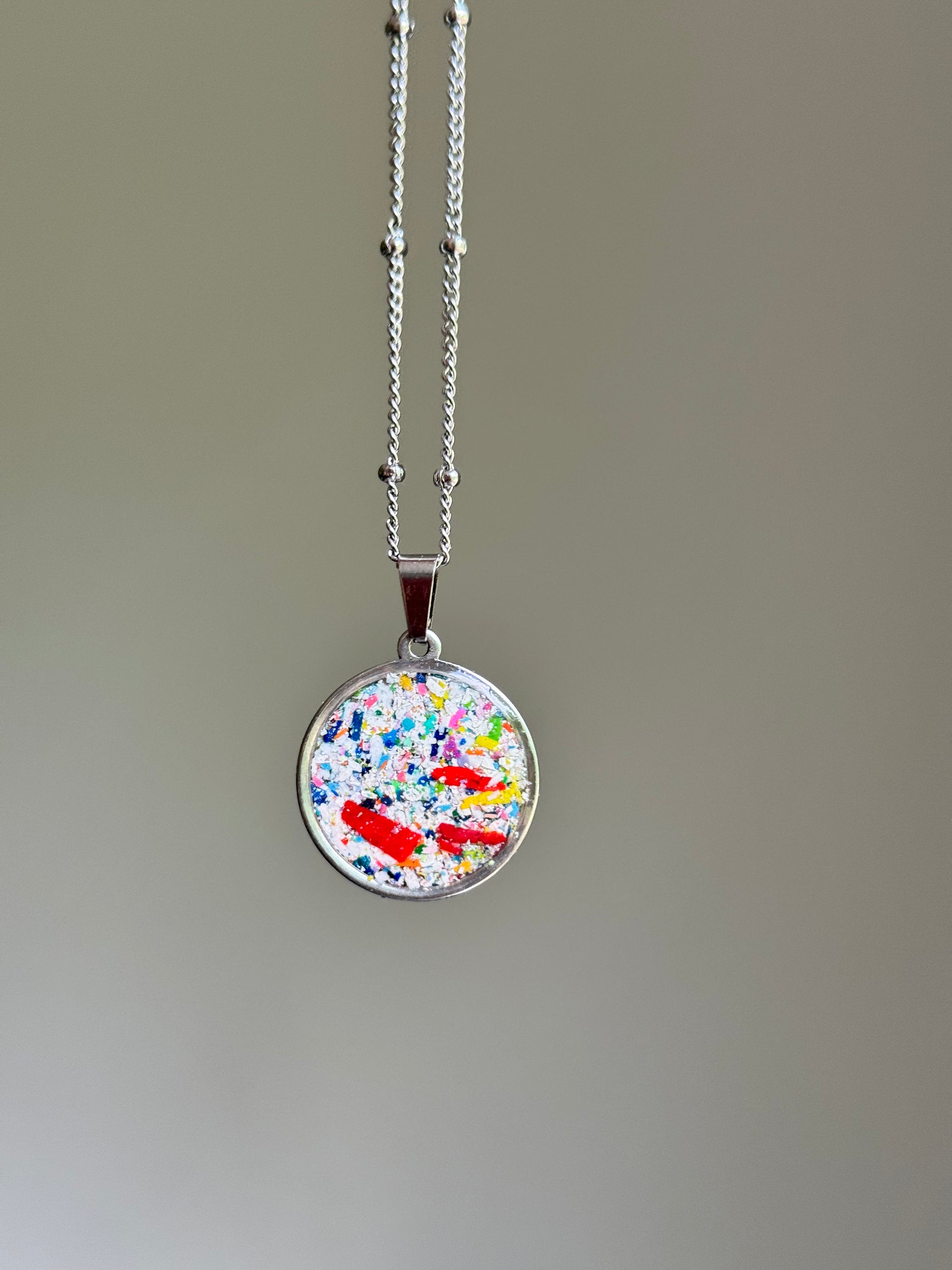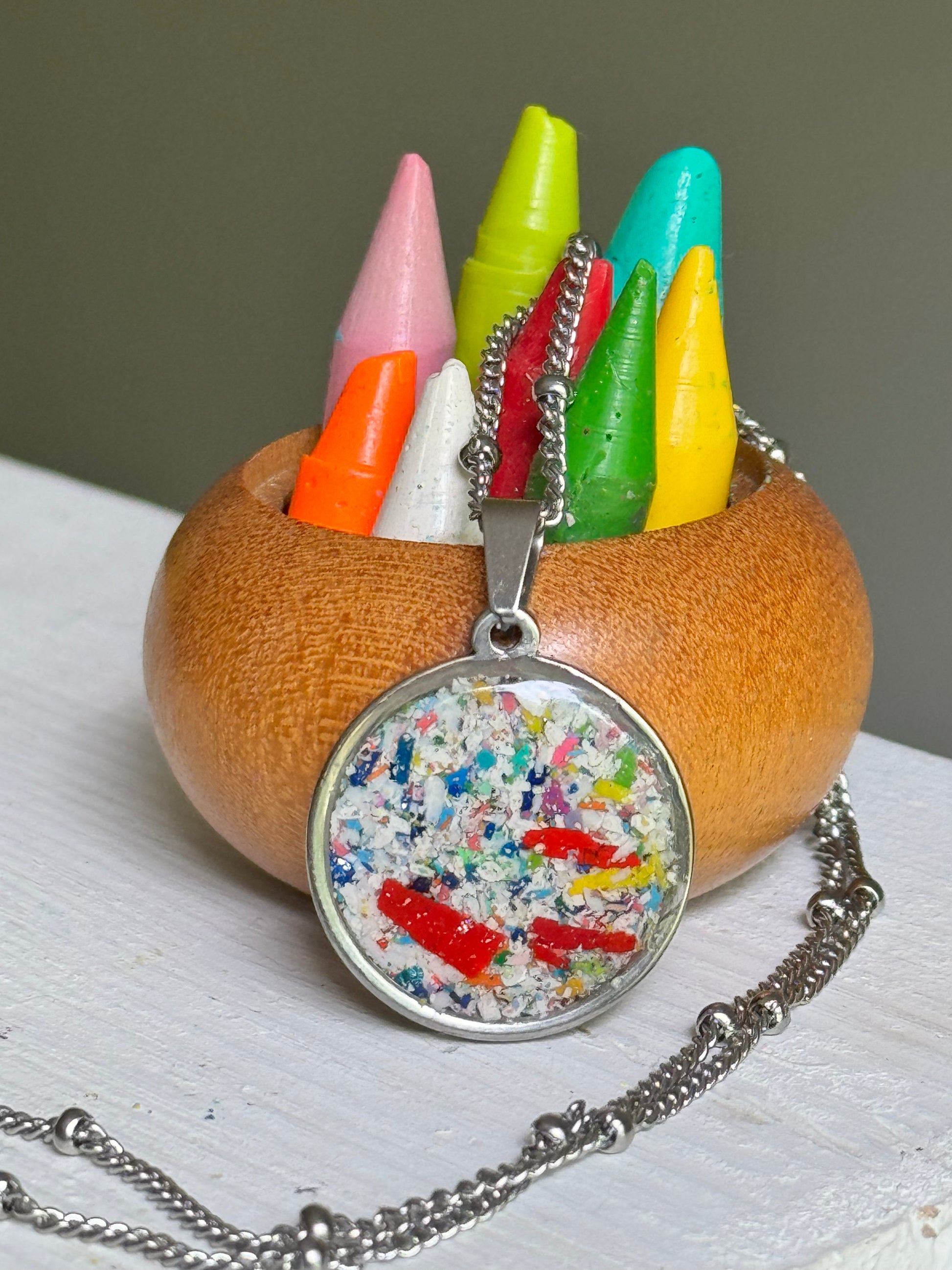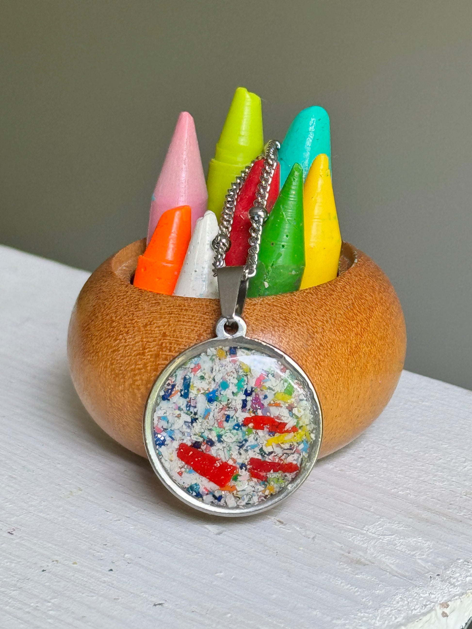 Show off your colorful side in this round, stainless-steel pendant with colorful crayon shavings. The recycled crayon shavings have been hand placed to create a textured look and feel.