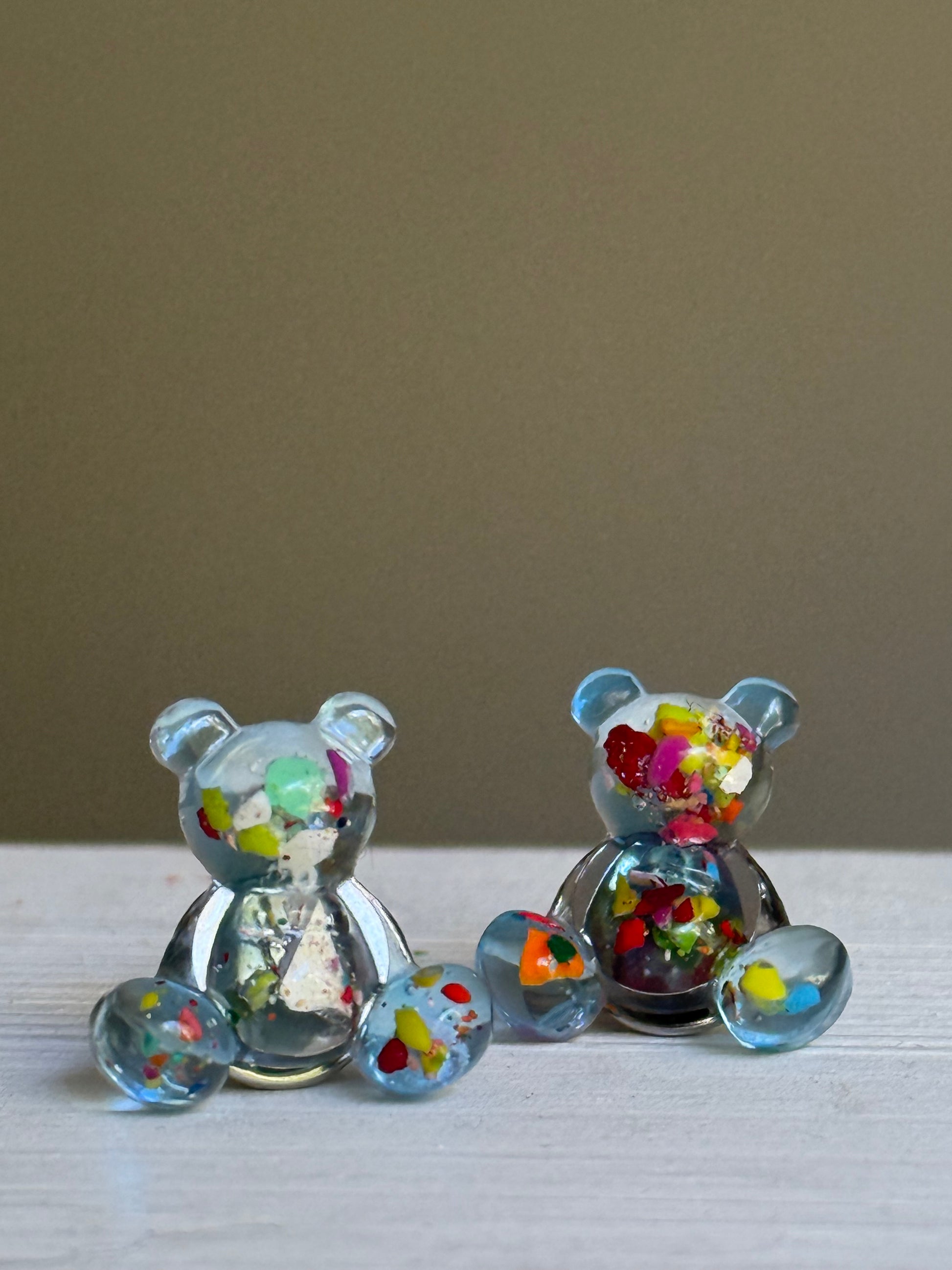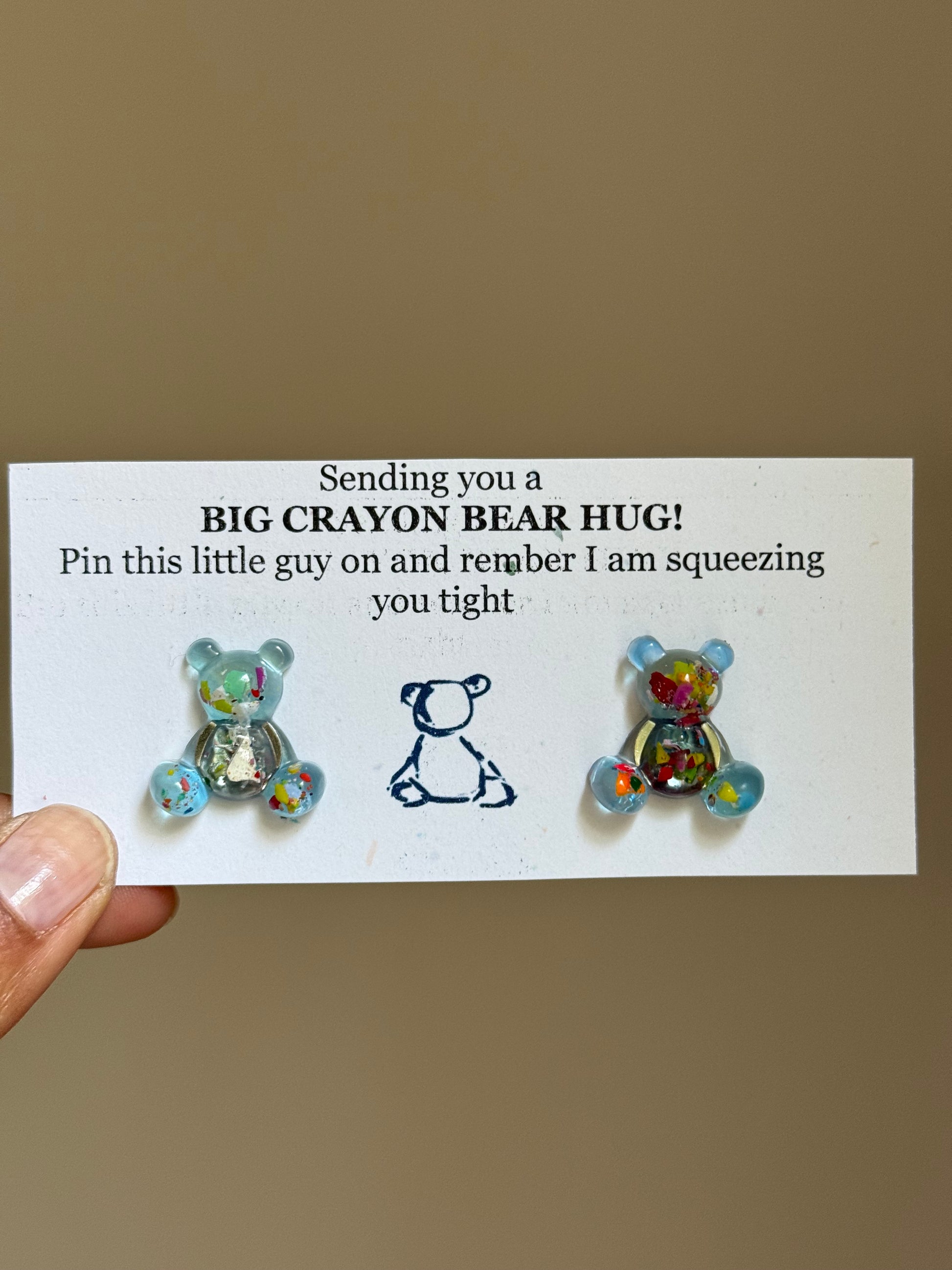 Our Crayon Bear Hug Push Pins are hand-made with recycled crayons. These crayon bear push pins are perfect for anyone who could use a hug in their day. Comes in a pair.