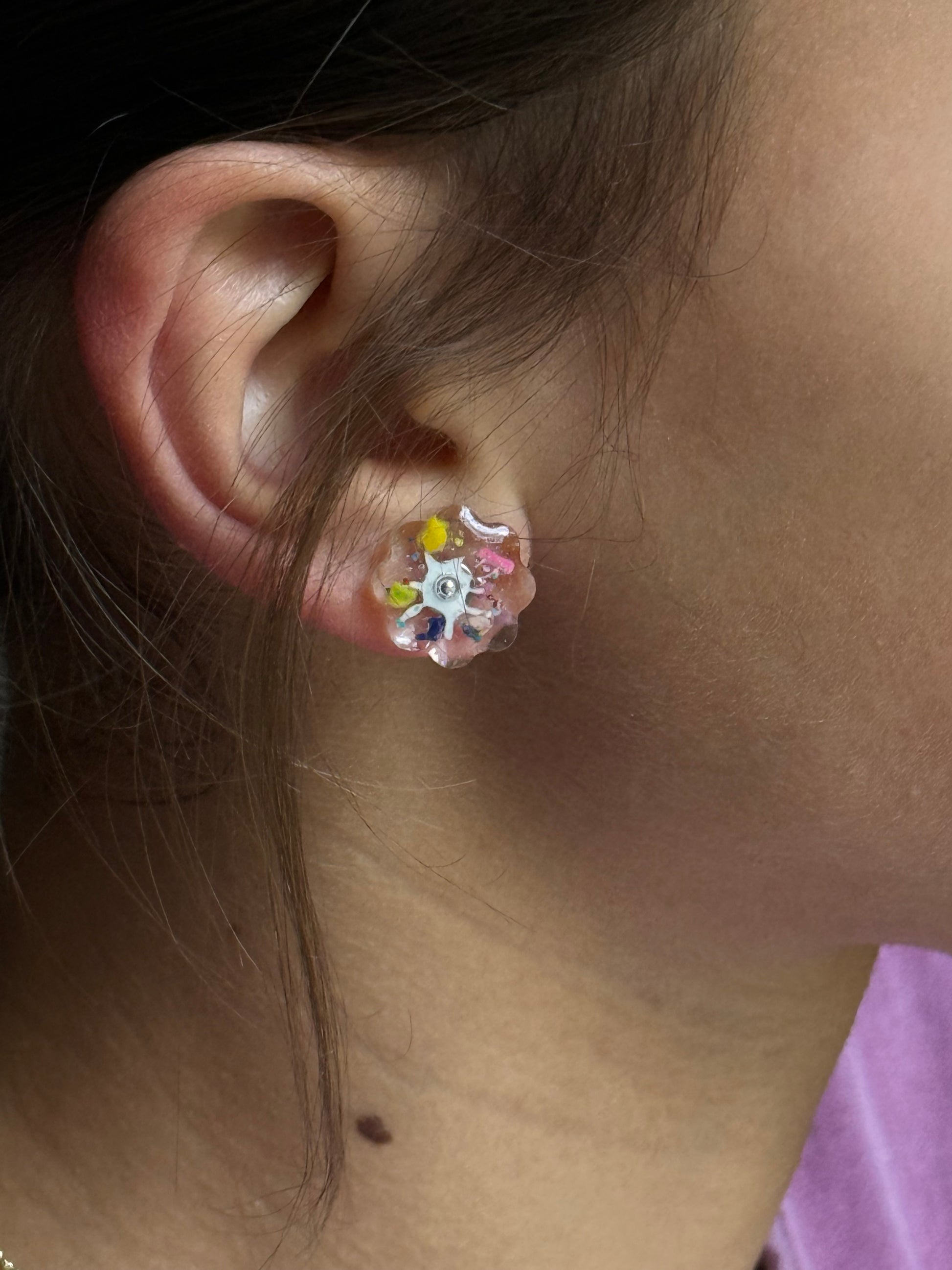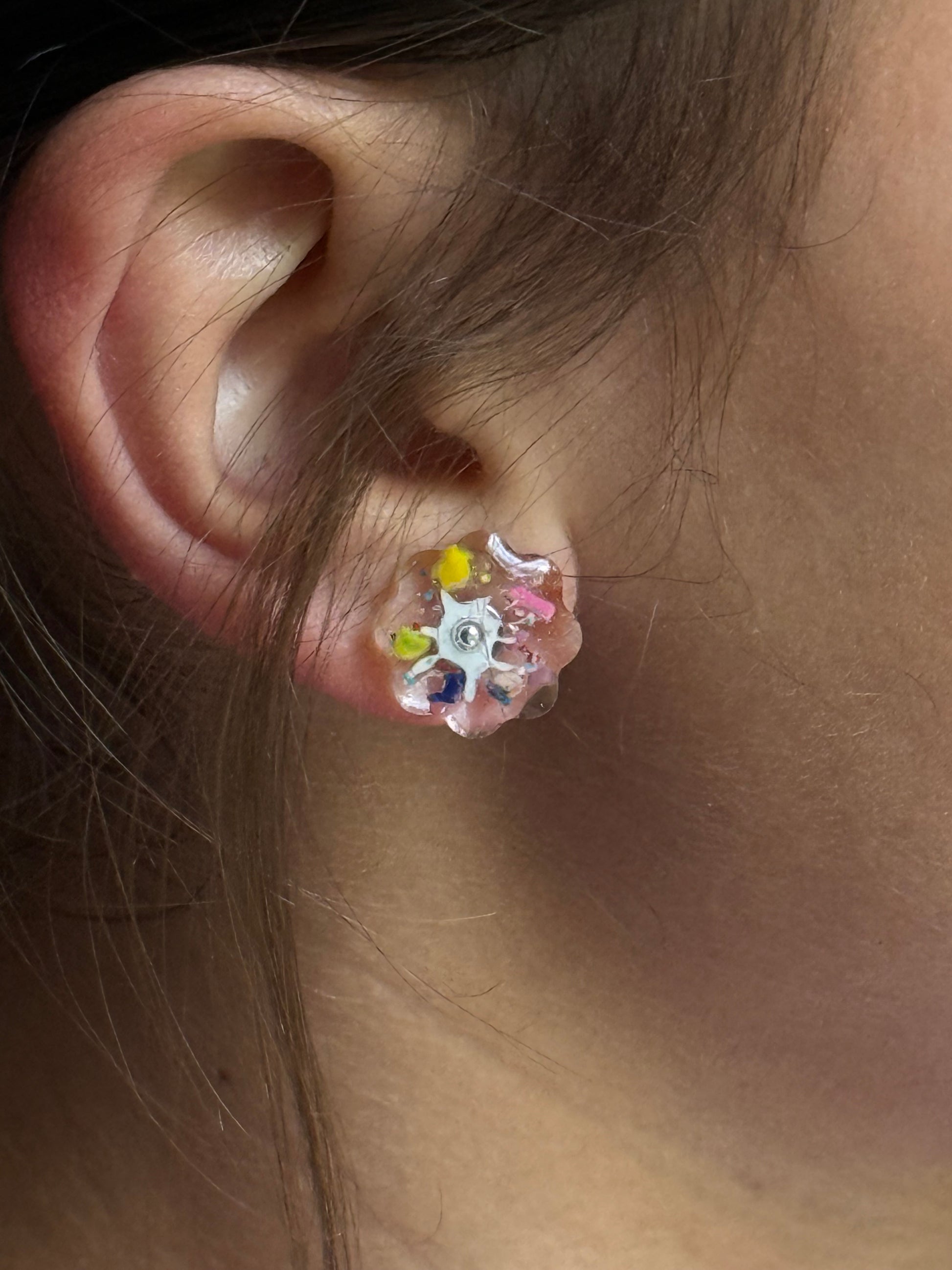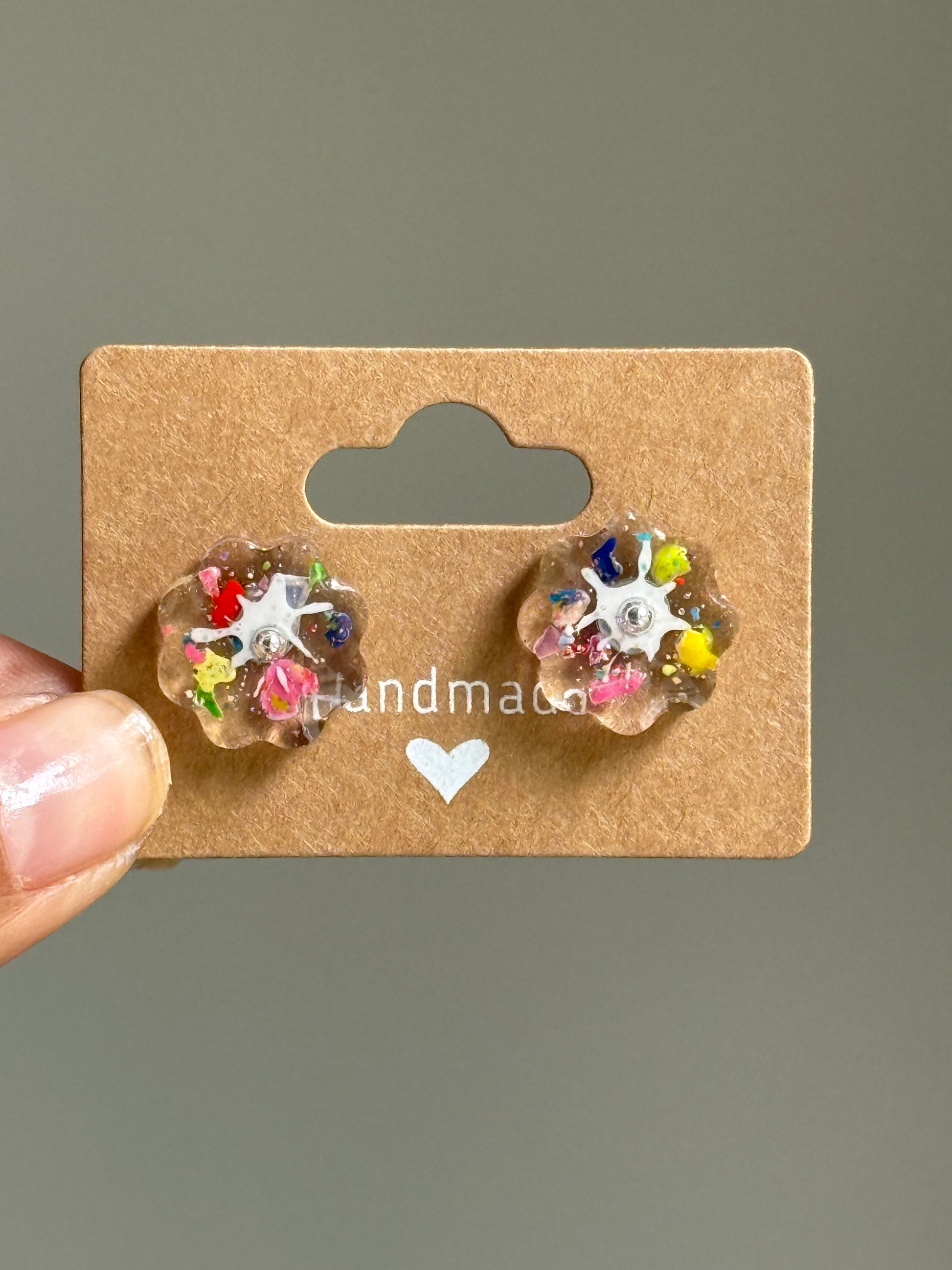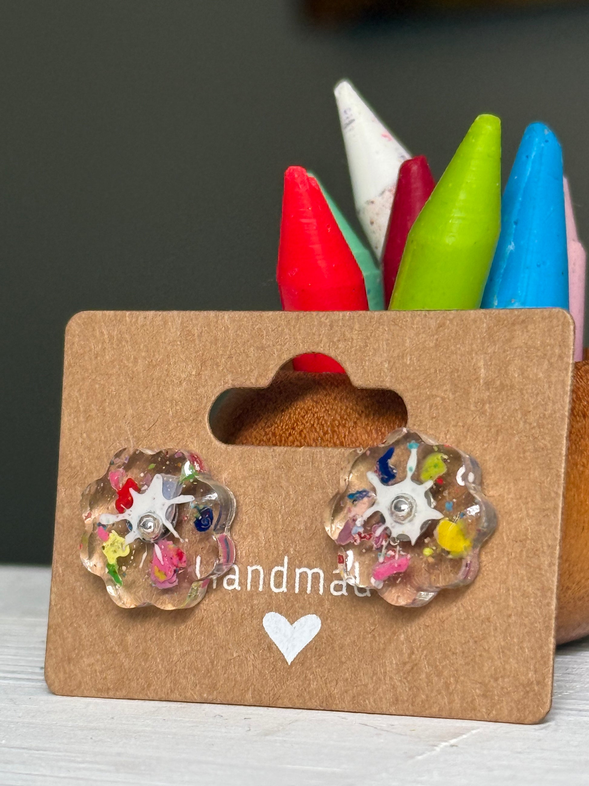 Our Clearly Colorful, Multicolor Crayon Bloom Studs are handmade from real crayon shavings and inspired by blooming flowers. Each pair features vibrant color combinations created with recycled crayons with stainless steel posts for sensitive ears.