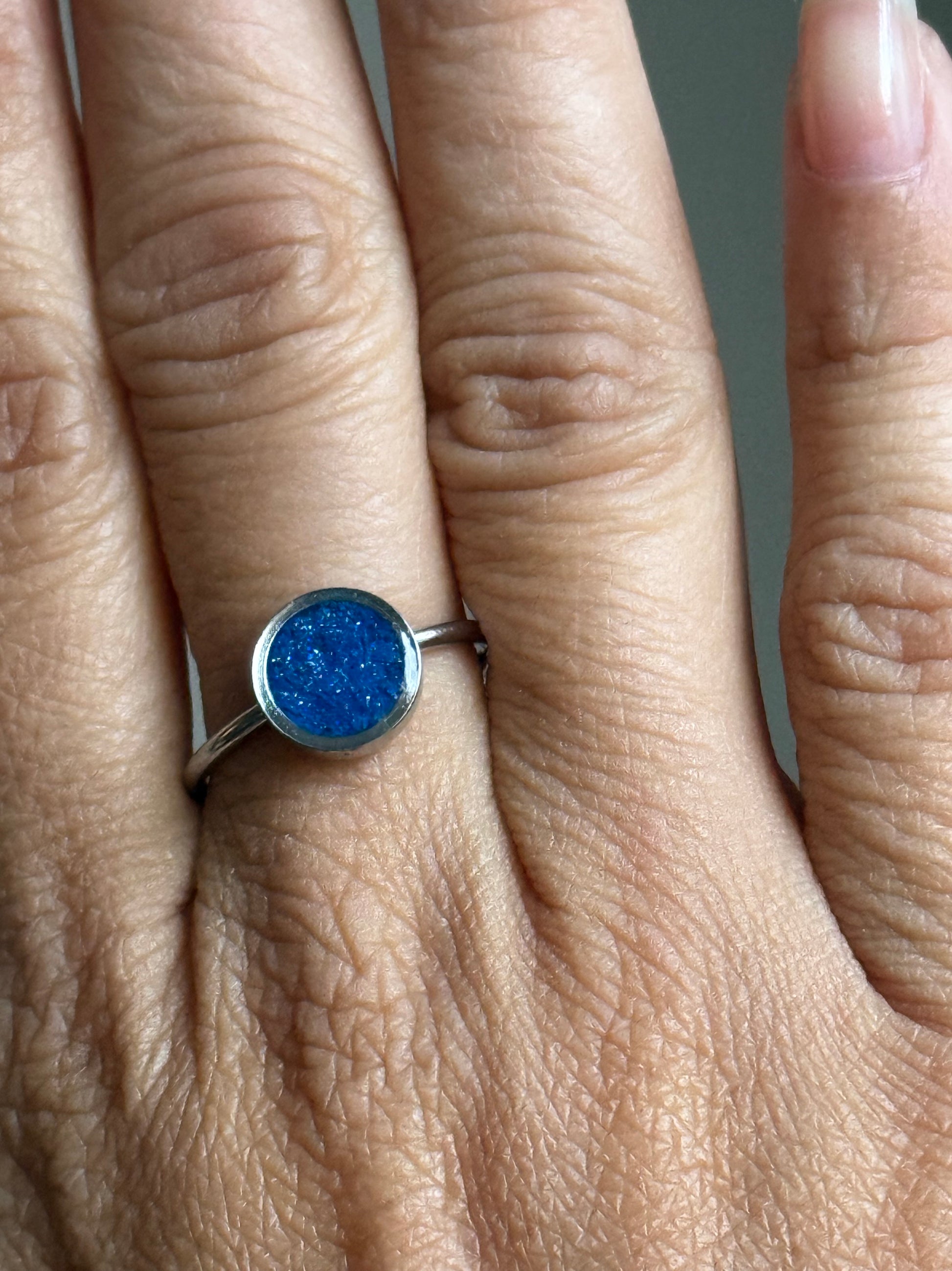 This is our version of dainty! We used metallic bright blue crayons only to give this small ring a little shimmer and sparkle. It's our crayon version of a Sapphire stone. A shimmery pop of color that will make you smile - specially during the holidays.