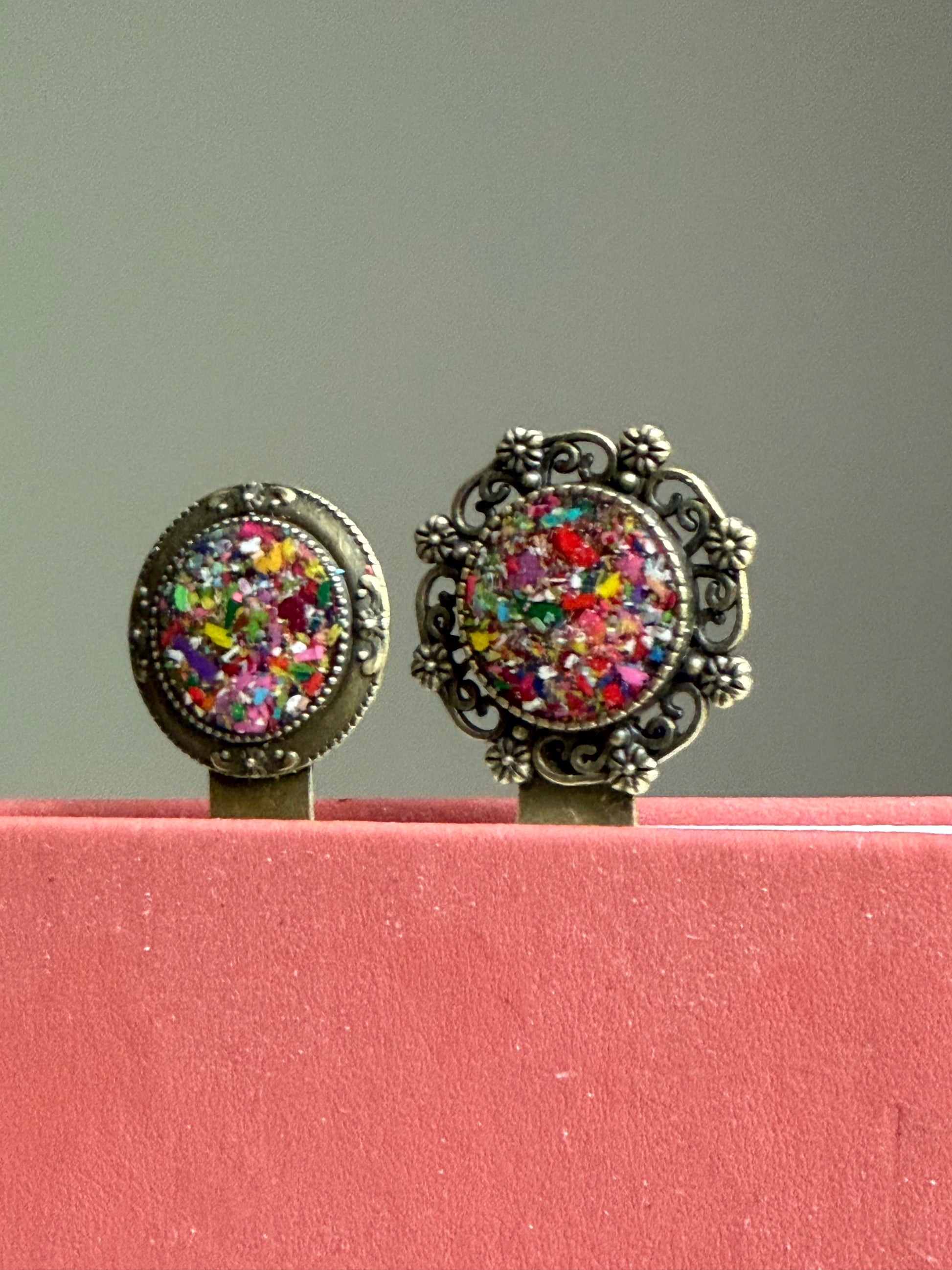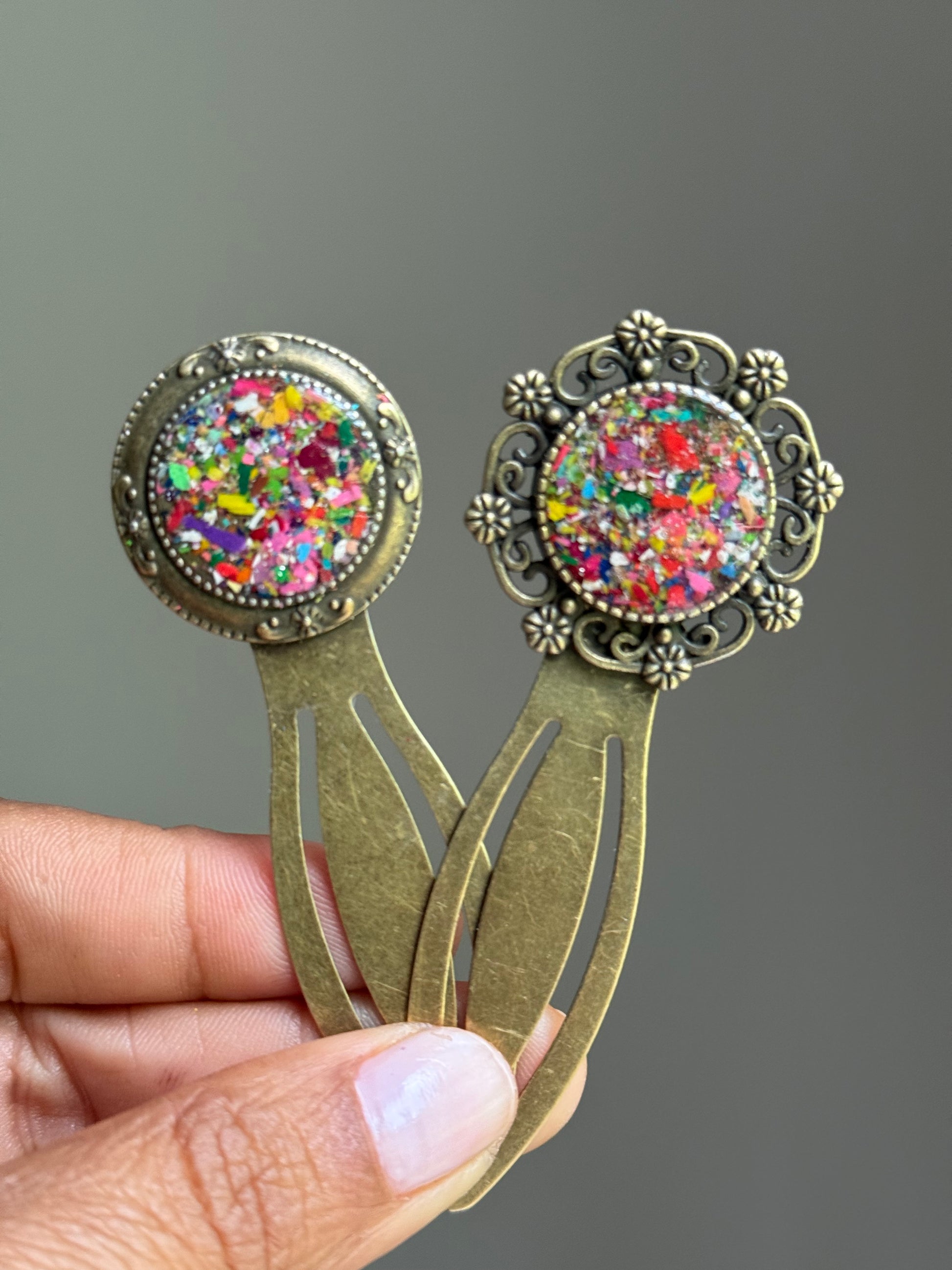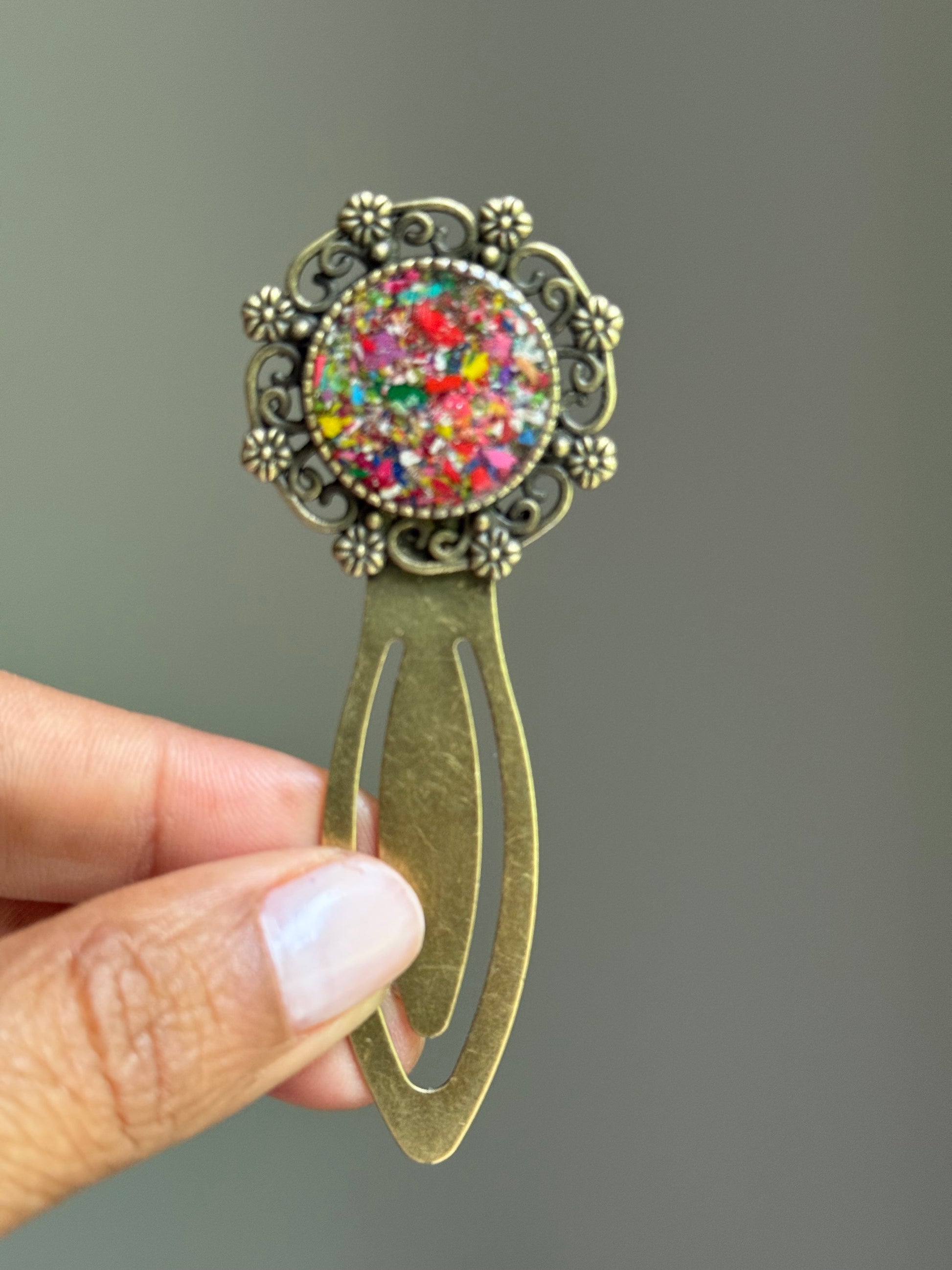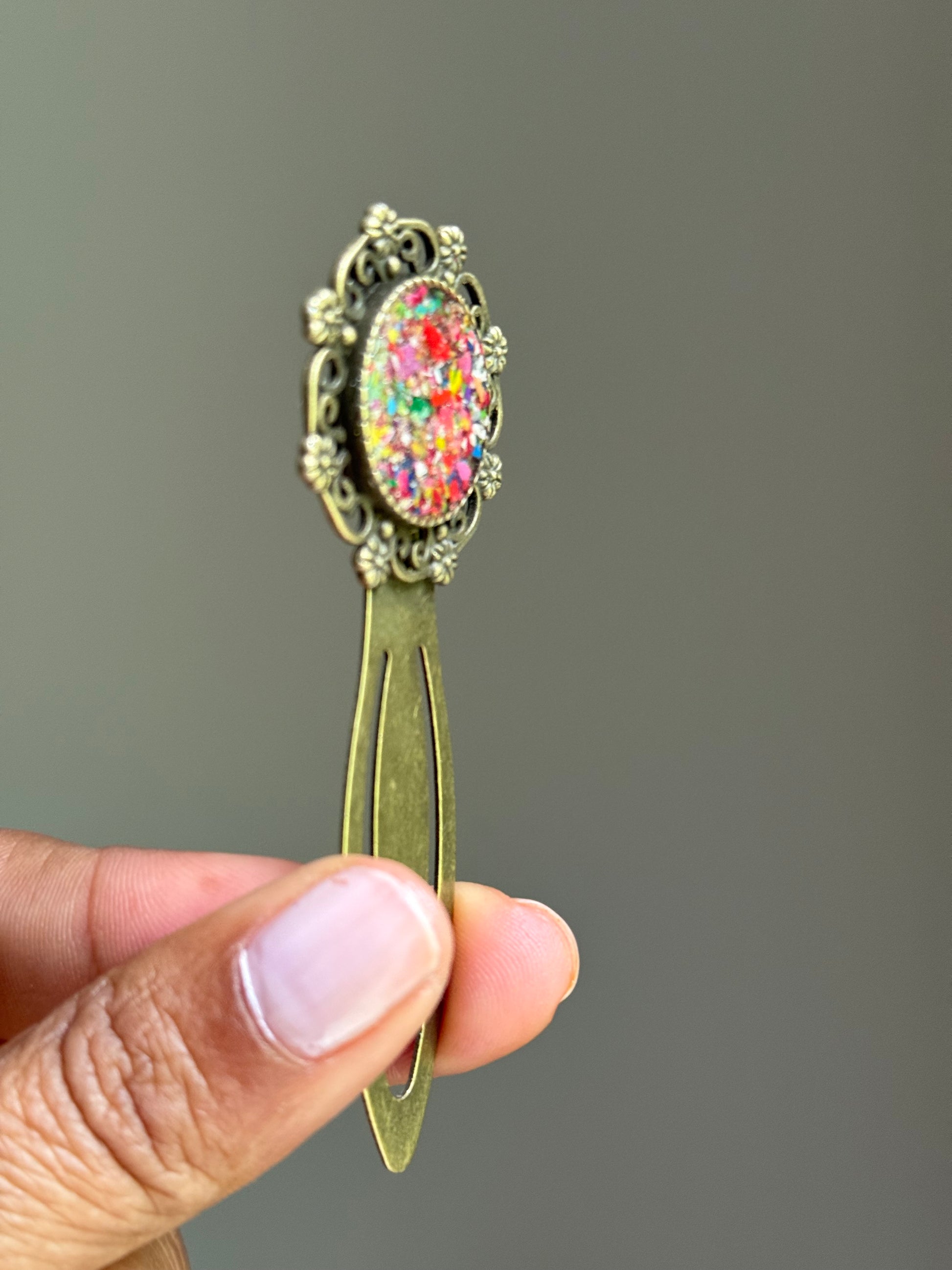 Our vintage-style, metal bookmarks are filled with real crayon shavings, sealed in glossy resin for a colorful finish. Whether you're marking your place in a book, your bible, or planner, this bookmark will help you hold your page in place.