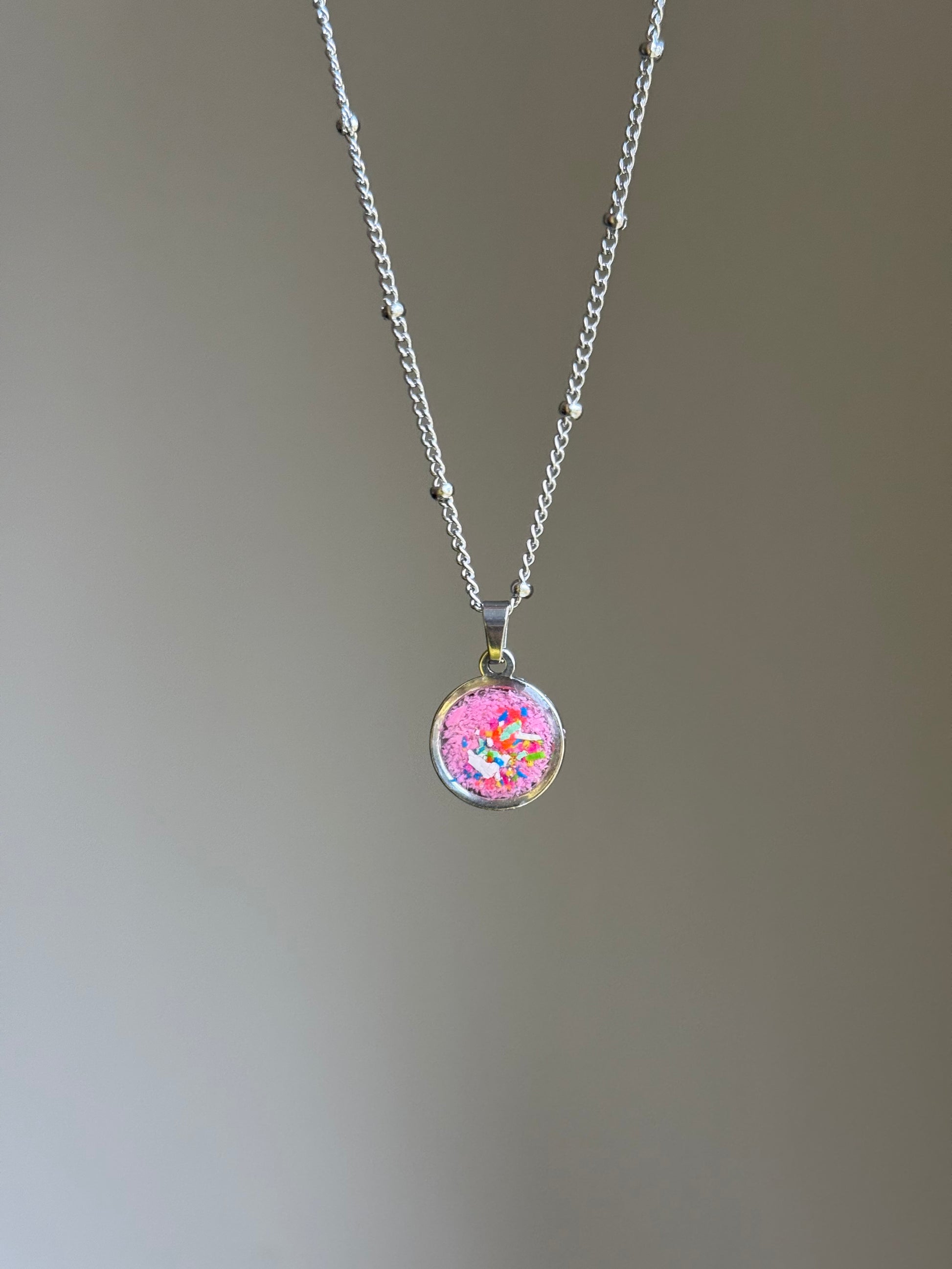 Our Orbis Crayon Pendant is elegant and colorful. This small stainless steel round pendant is filled with hand-placed crayon shavings making its color combination truly unique.