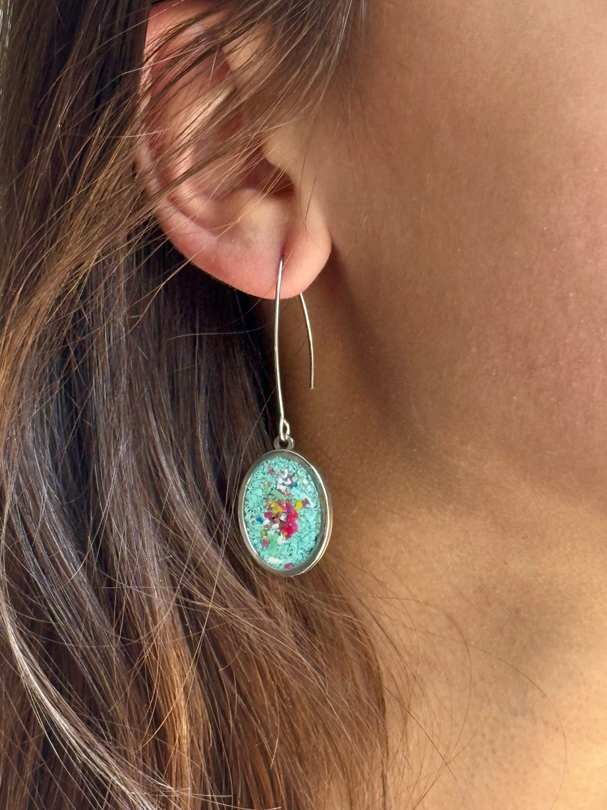 Our Prisma Drop Earrings are colorful and lightweight. The long, stainless steel hooks give this classic oval shape a sleek and modern look. Perfect for sensitive ears (won't pull).
