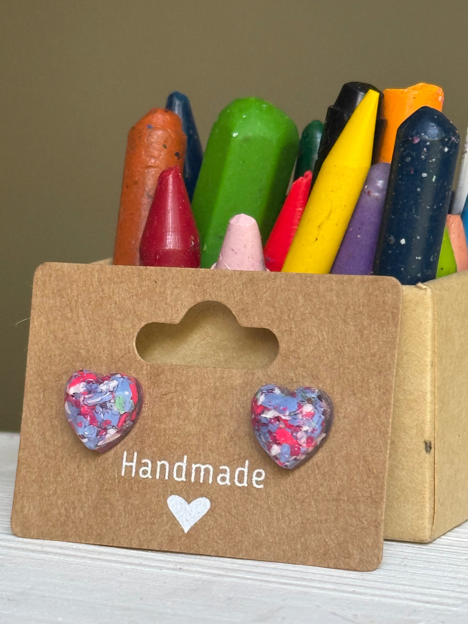 These small resin studs look like little gems! Created with recycled crayons, each pair is colorful and gentle on your ears due to our hypoallergenic posts.