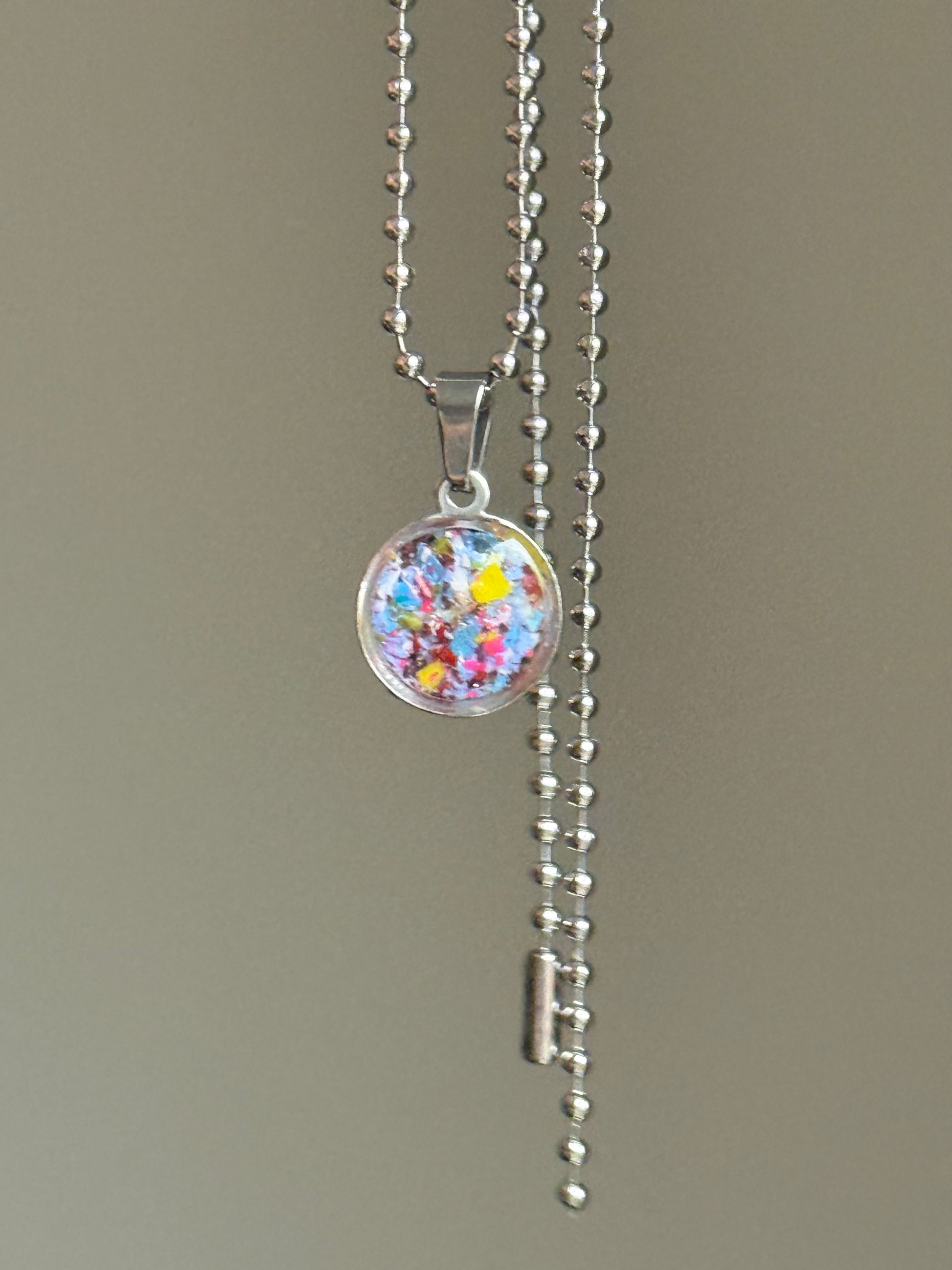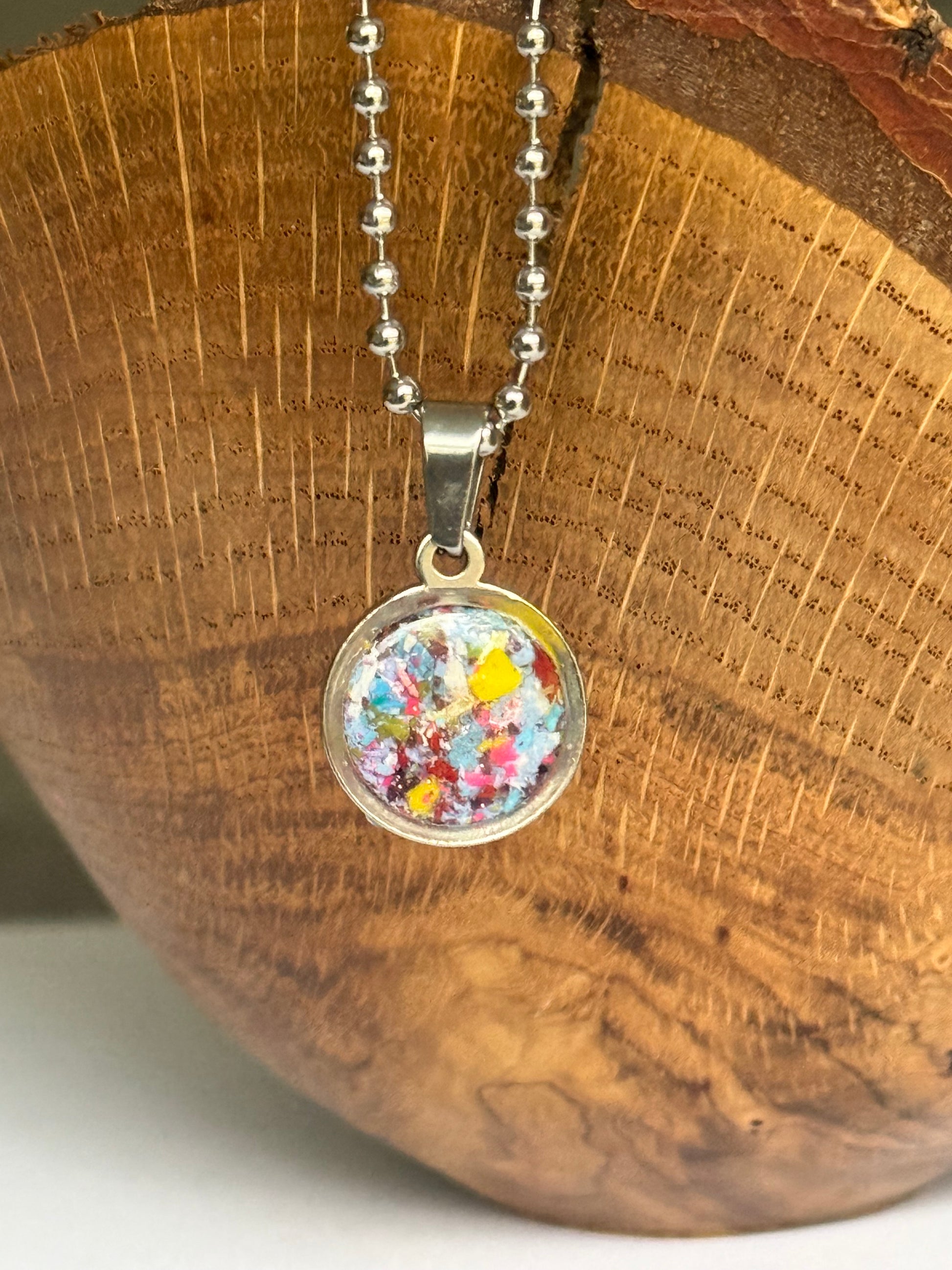 Our Orbis Crayon Pendant is elegant and colorful. This small stainless steel round pendant is filled with hand-placed crayon shavings making its color combination truly unique.