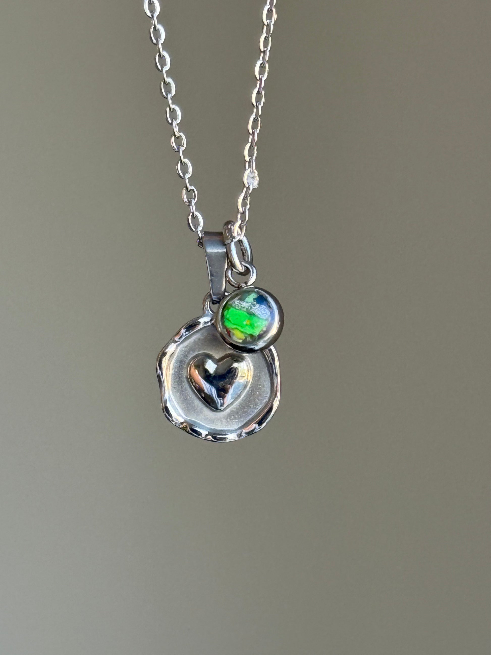 This stainless steel round pendant features an embossed heart in the middle. Playfully hanging alongside is a tiny Viva (multicolor) mix charm.