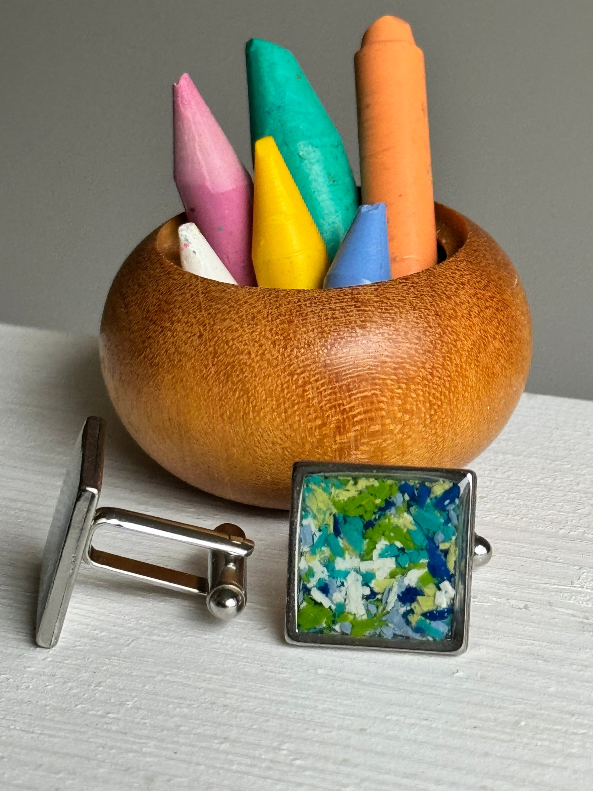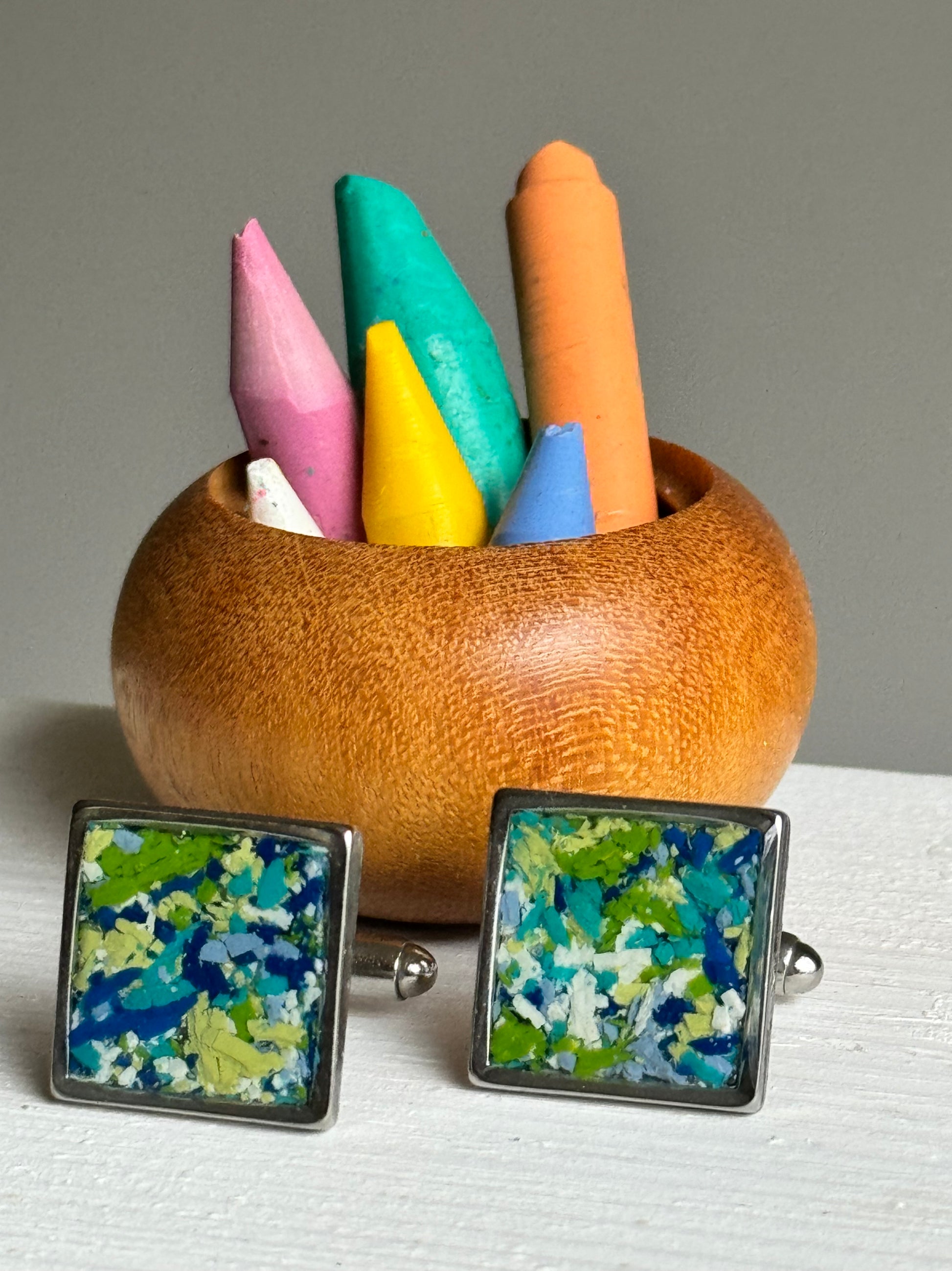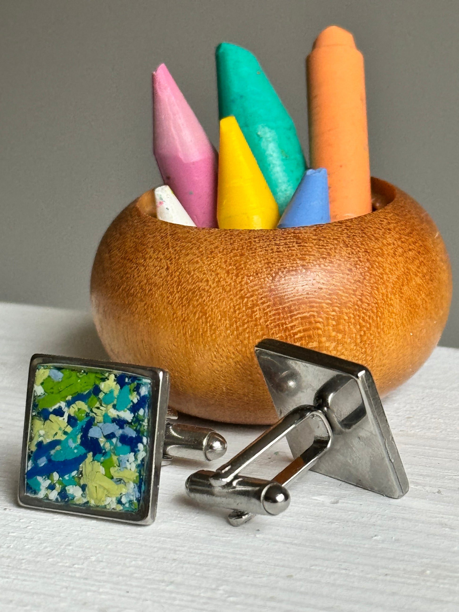 Stainless steel, square cufflinks in bright greens, blues and white. The crayons are hand-placed to create a textured and modern look.