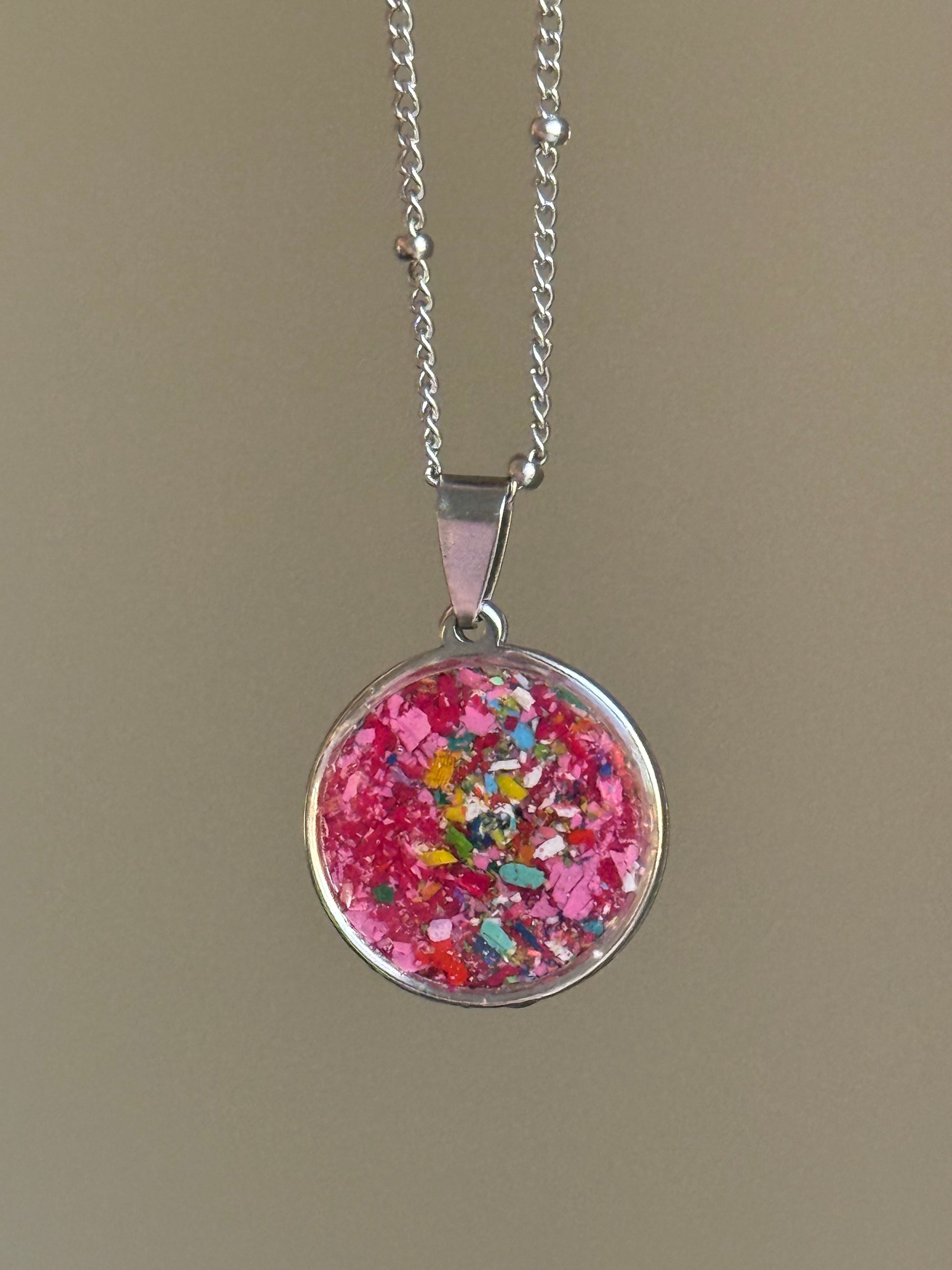 This round stainless-steel pendant captures real, recycled crayon shavings in a perfectly balanced composition, creating a piece that feels both playful and intentional. Every shaving is placed by hand, giving the surface a rich, tactile texture and making each pendant truly one of a kind.